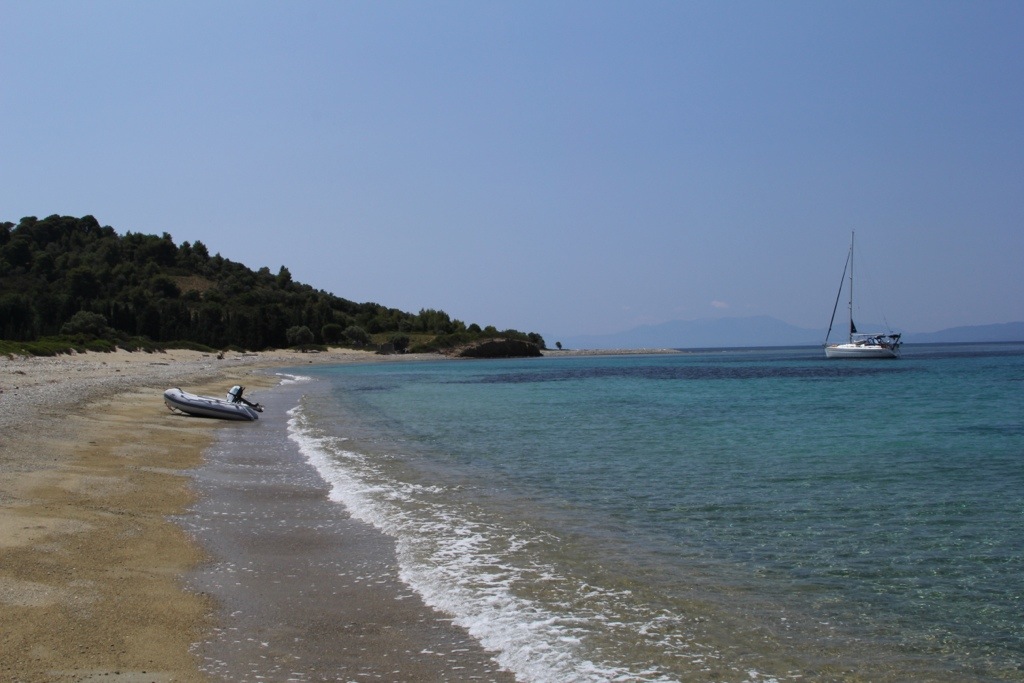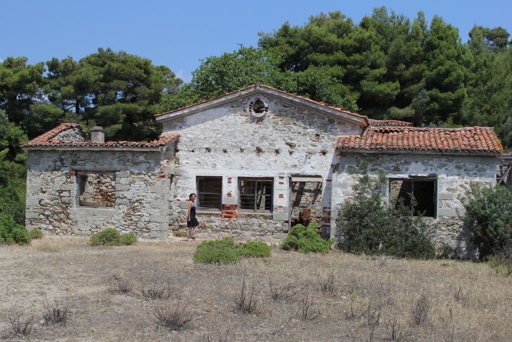 Walking around the island we noticed an old abandoned building that had large terra-cotta pots inside it and what looked like olive presses. It was surrounded by old olive groves still producing olives as evidenced by the multitude of olive pits upon the sandy shore.