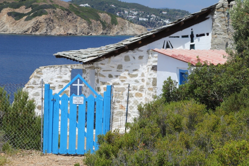 Precariously perched high on the headland between Floris and Lalaria beaches is an oddly-shaped Ag Floros church. Unbelievable view and a quiet sanctuary from the midday Grecian heat.