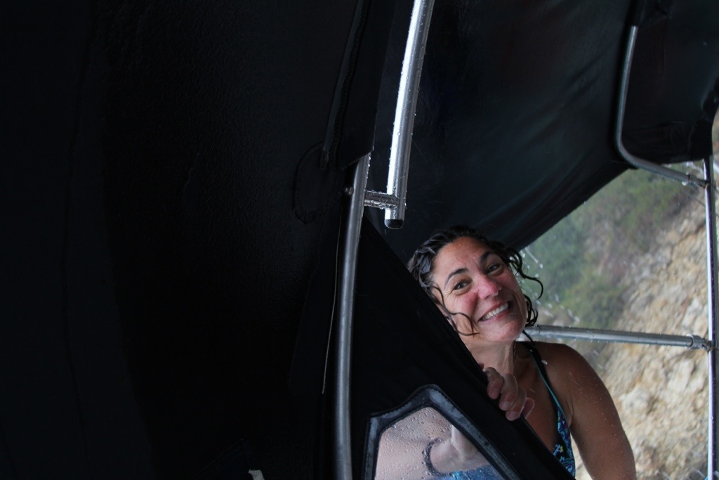 Tawny and I donned our suits and headed out into the rain with some soap. It had been several days since we had a shower and the rain was so torrential it took the soap off you before you could lather it. The unexpected hail was exfoliating. The thunder and lightning all around us was a bit disconcerting since we were the highest mast in the bay. But the refreshment of a cool shower was worth it. We caught several buckets of the soft rain water from the boat’s dodger to keep for future bathing. On shore we saw flash flooding with torrents of rain coming down the street by the tavernas and waterfalls forming on the cliffs around us.
