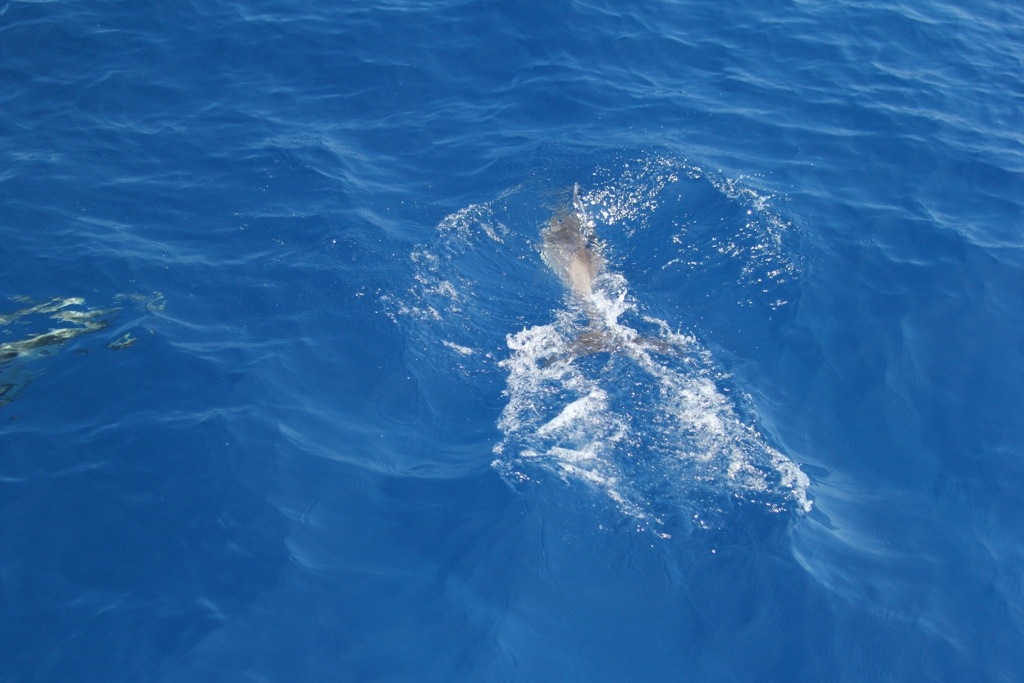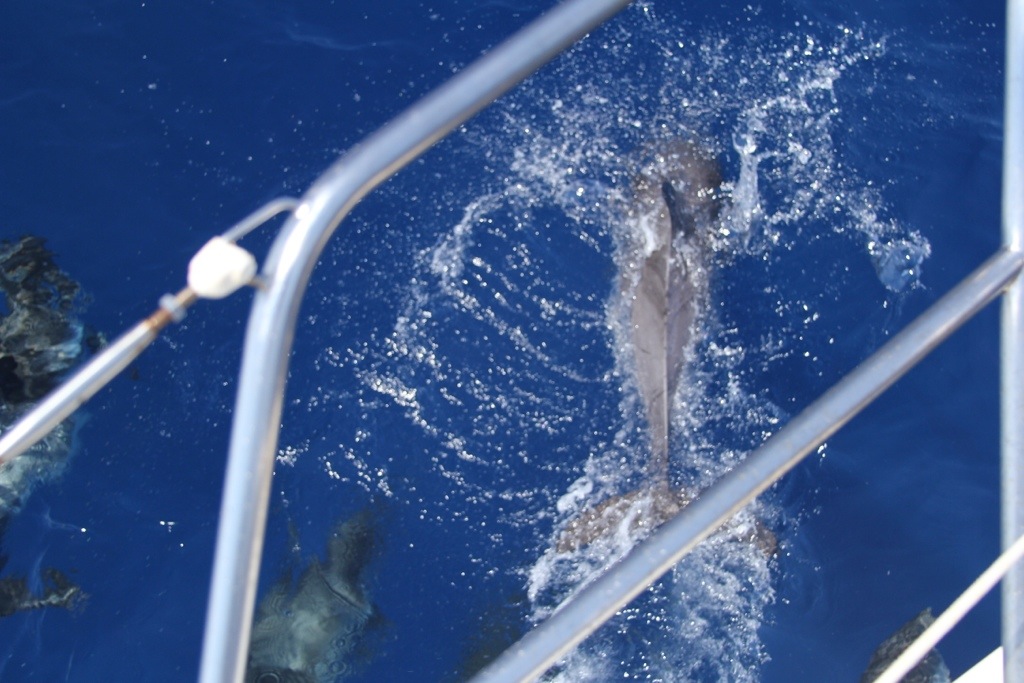 Tuesday we left Skiros by 8:45 in the morning for he 38 nautical mile sail to Stafylos Bay back on Skopelos. The day was hot and uneventful with wind finally building enough that we could sail for a few hours. The highlight was seeing a school of dolphin headed south cross us as we headed west. They took a slight detour and came to play for a few minutes in our bow wave.