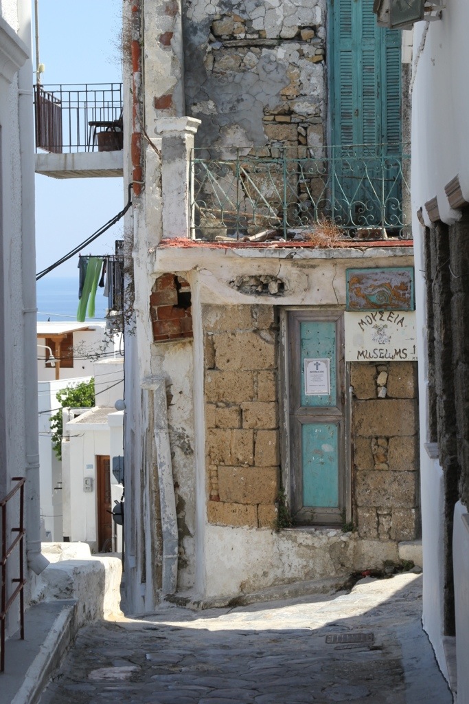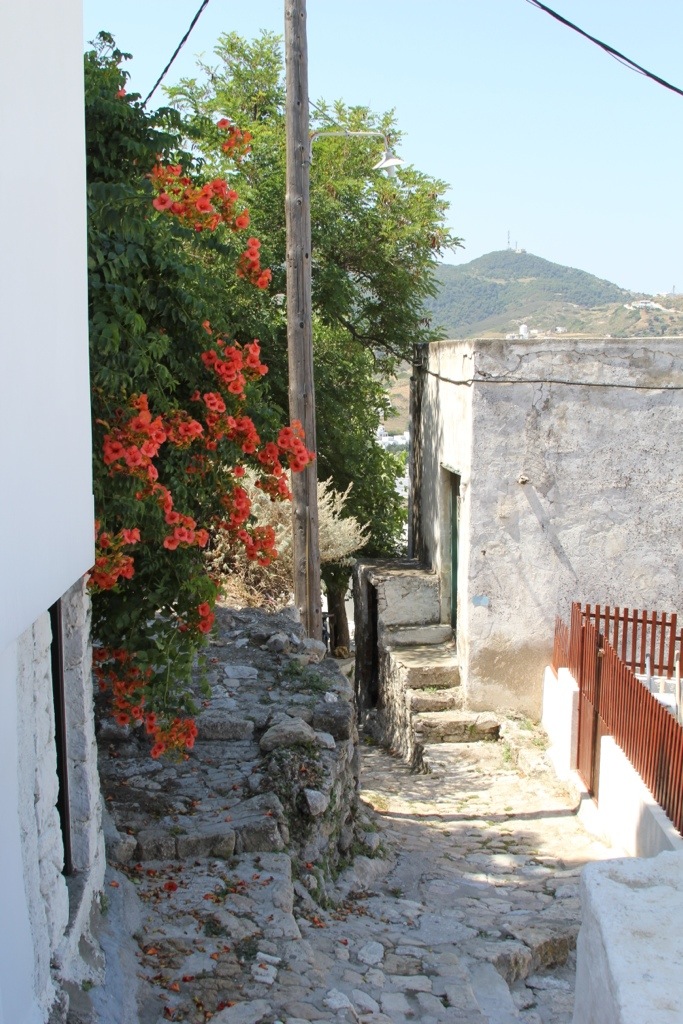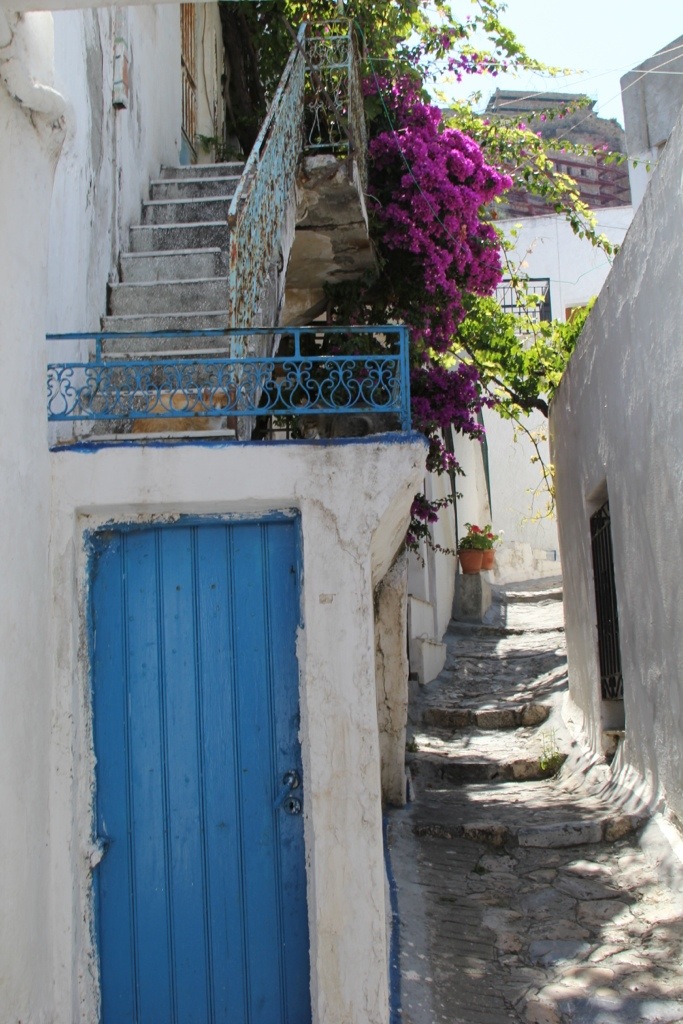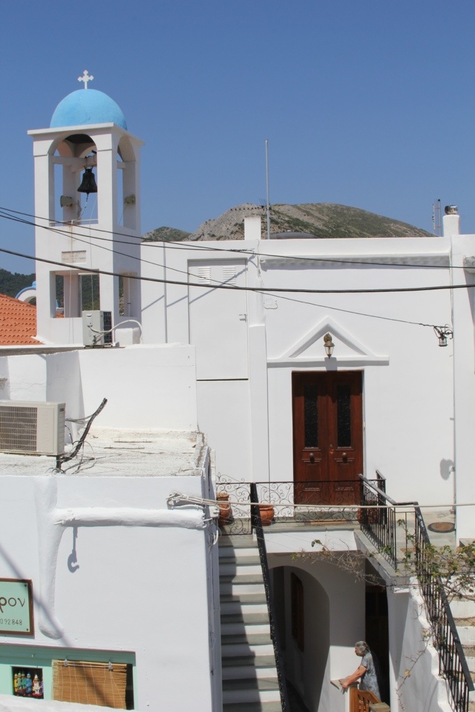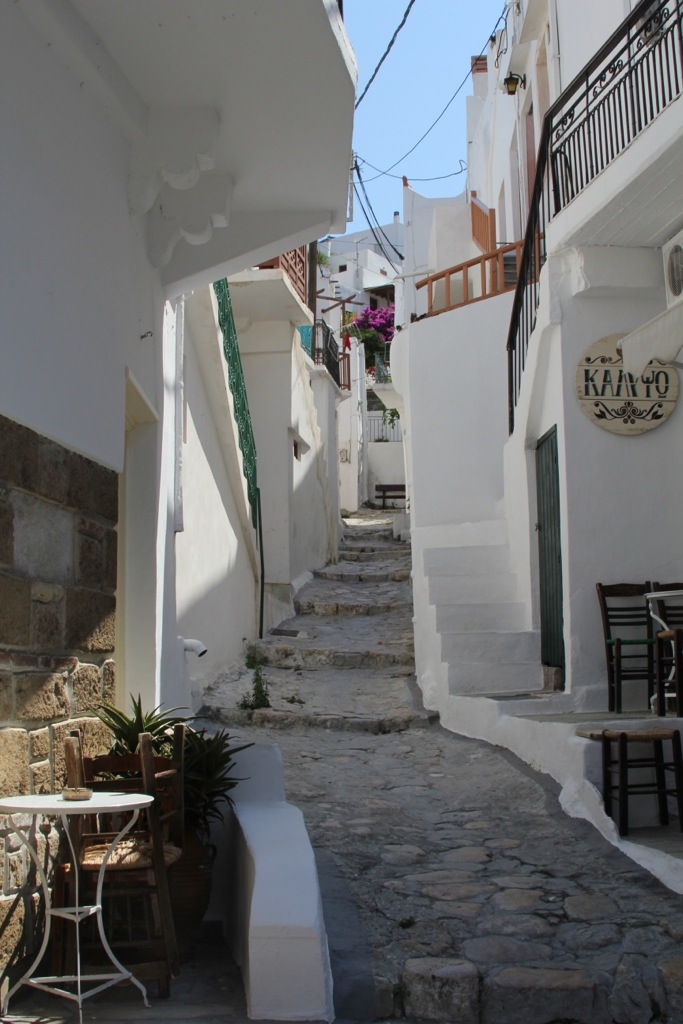 Monday we hired a taxi and went to Skiros Town (also known as Chora or Hora). Its a beautiful cubist style town perched upon a cliff overlooking the sea on the windward side of the island. The town has an interesting history. It has a prominent castle on the top of the mountain that used to be an acropolis and was converted into a monastery of St. George. It was under construction due to damage from an earthquake when we were there so we couldn’t go inside but we did walk the winding streets up through the town, over rooftops and small alleyways built atop each other so we could see the view from the top. It was spectacular.