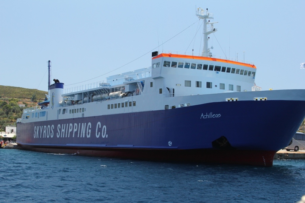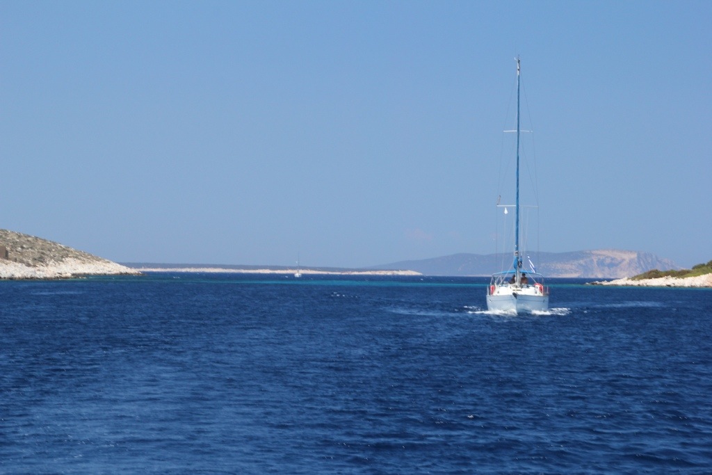 Sunday (Father’s Day) we headed for the Skyros about 20-30nm away. We got an early start. Again there was no wind so we had to motor to Skyros instead of sail. It was still several hours before the island began to take shape before us. We decided to use the Valaxa Strait which would remove 6nm from our trip. Valaxa Strait is a very shallow and narrow passageway between Valaxa Island and Skyros that opens into Kalamitsa Gulf and Linaria Bay (the fishing town we’d spend the next few days). Much of the depths in the Valaxa Strait are only around 3 meters (we draw a little of 2 meters with our keel). But there is a sweet spot in the middle of about 5m deep. We posted watches on the bow and the water being so clear it was easier than anticipated to maneuver the boat through.