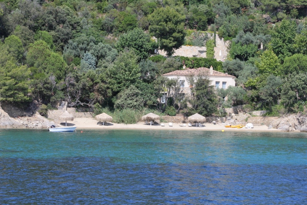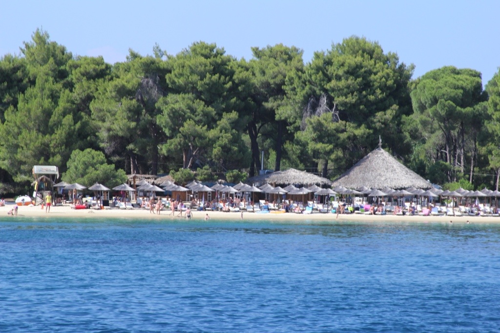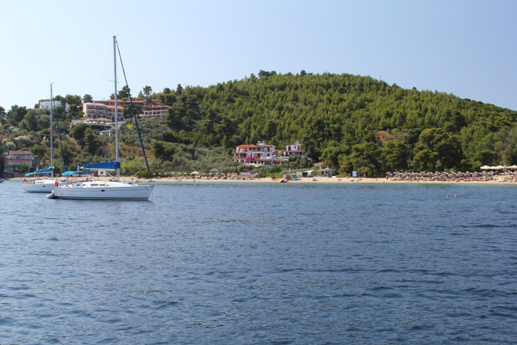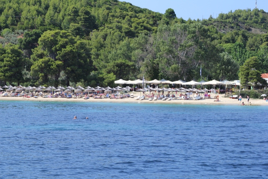 We anchored at famous Koukounaries Bay. Its said to be the nicest beach in Greece, but also voted one of the top 7 beaches in the world. The sand is like gold flecked talcum powder – very fine sand but with flecks that sparkle gold in the sun. Its a shallow gradual beach so the water is warm. It fronts a lagoon with a wildlife sanctuary behind it.