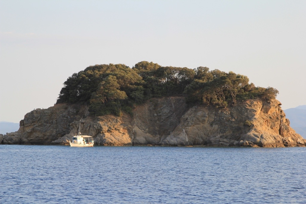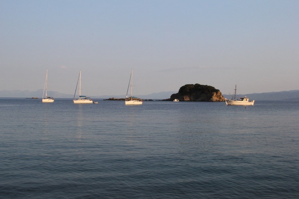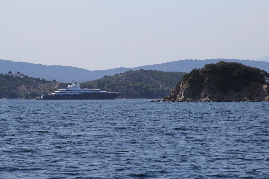In the afternoon tour boats from Skiathos Town started coming in and the beach filled in by the hundreds. Although we were enjoying the people watching others wanted to head to a little bay around the corner for the night. So we went back to the boat and navigated the dangerous shoal Vrak Marines to Troulos Beach and found ourselves the only boats (except for 1 Greek fishing boat) in the bay. We could still see the mega-yacht Al Mirqab. It was our warmest swimming area yet. Clara went ashore and tried a paddle board (but it was really an unstable surf board so the very nice beach rental people refused to take payment for it.)