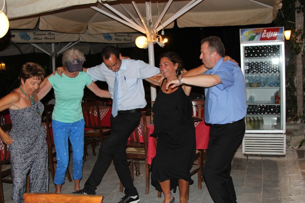 We went ashore that night for dinner at Troulos Taverna. Food was good and we had breem (a delicate white fish) for the first time. The taverna had a cute little kitten that Clara was very smitten with. As the evening wore on and the wine and ouzo was poured it deteriorated into dancing with the wait staff. A fine evening.