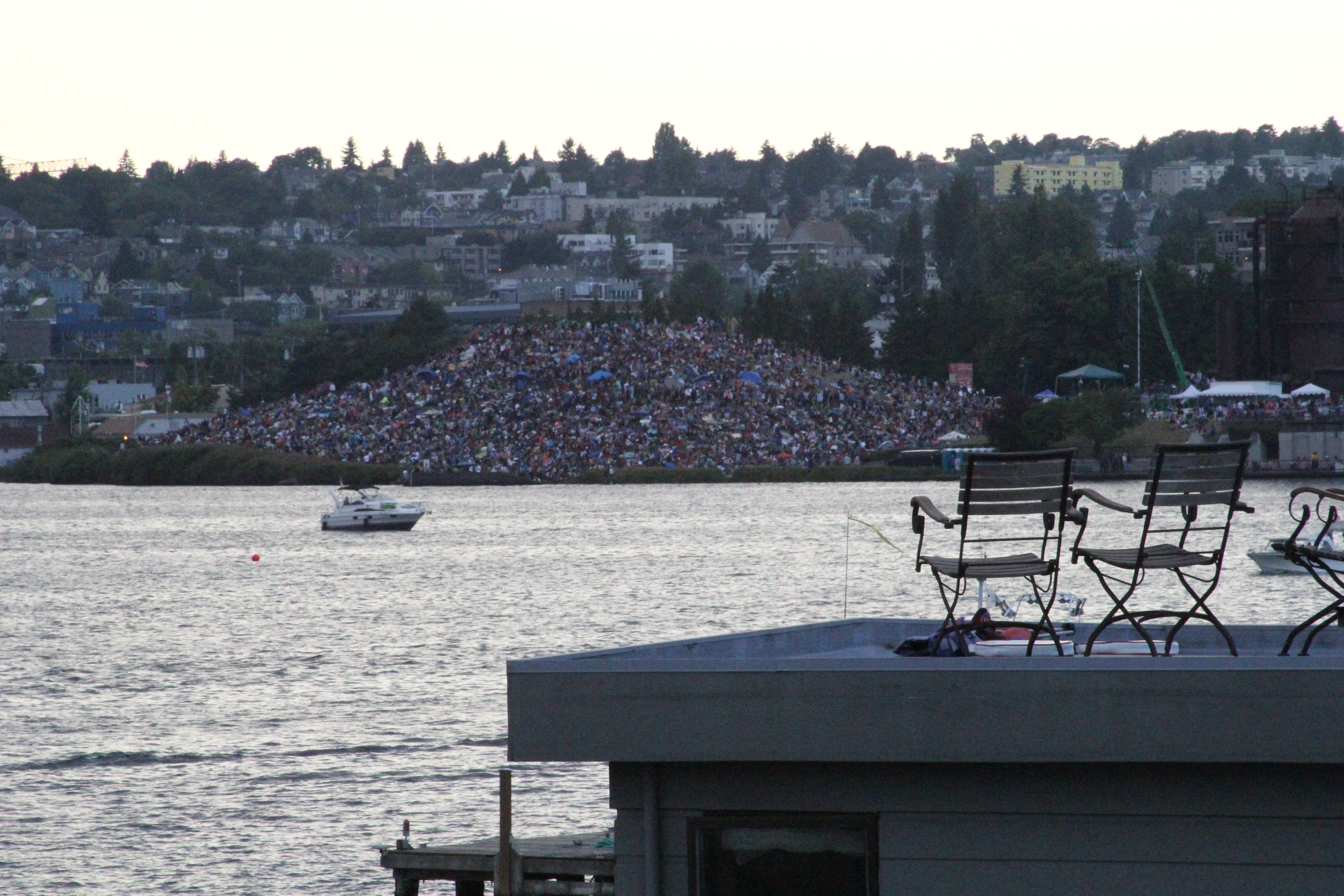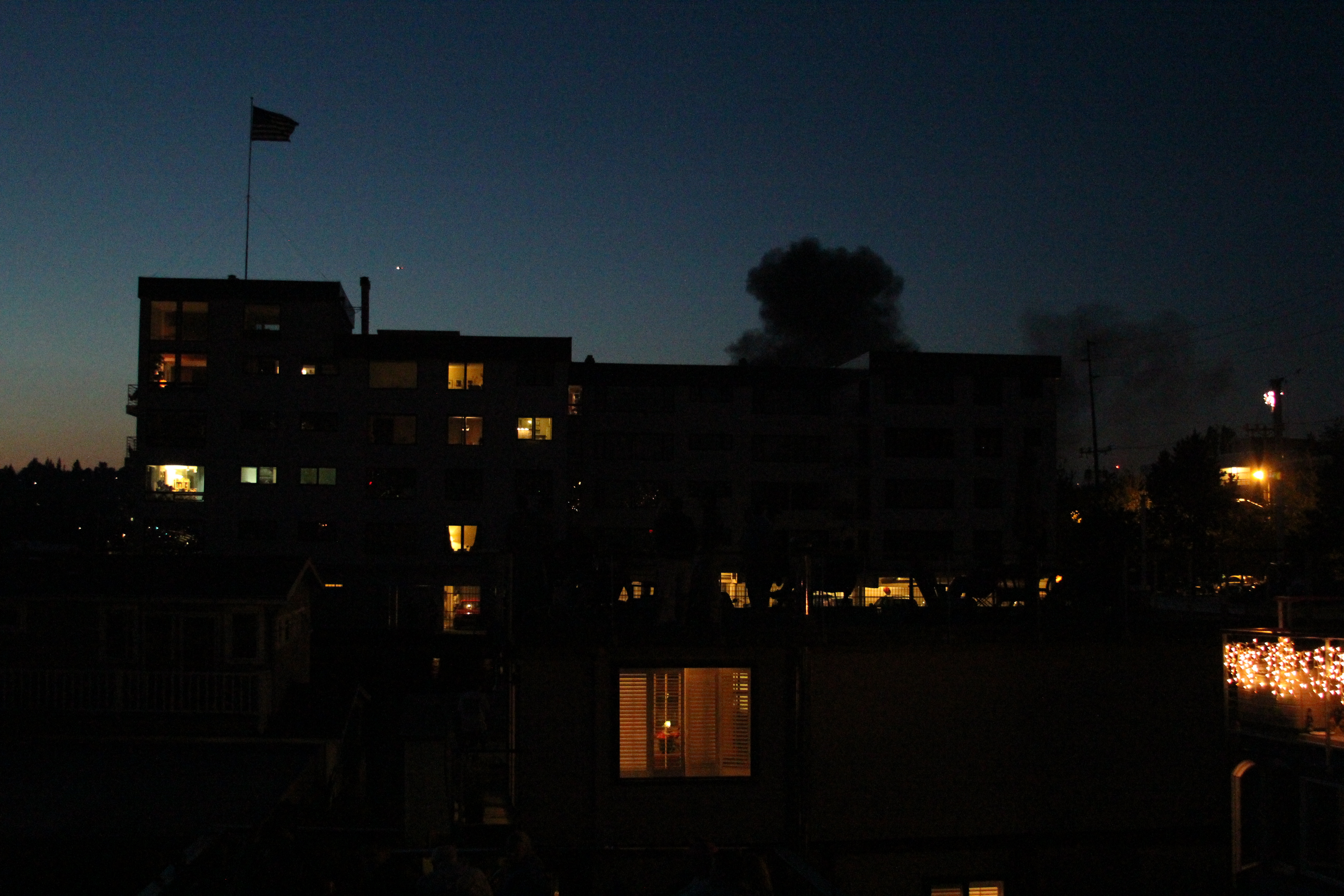 We bided our time with views of the action from the roof. Hordes of humanity covered every inch of Gasworks Park. South Lake Union was bow-to-stern and boat-bumper-to-boat-bumper. Meanwhile, the black smoke of an uncontrolled fire wafting through the neighborhood behind the houseboats (affectionately called “Little Beirut” each 4th) didn’t curtail the ignition of reservation fireworks punctuated by yelps of “‘Merika!” “Whoot!” and “Fuck yeah, dude! That was fuckin’ awesome!” Uh…merica, you are beautiful. Happy Birthday. The fire was apparently a boat storage facility that caught fire. $1.5M in damages.