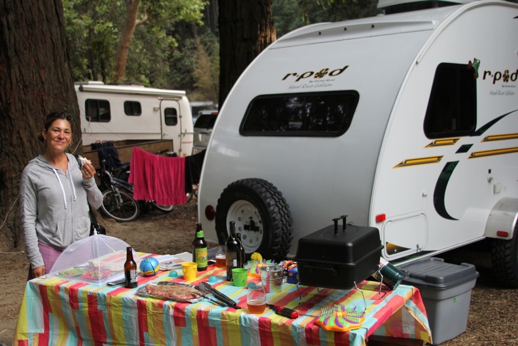 We headed on to Monterey but decided not to stop so we could get to our site in Big Sur. Gilroy was 91 degrees, and when we hit Monterey and Carmel it was only 62 and foggy. We headed down the spectacular coastline, with some white-knuckle-cliff-dangling-one-lane-under-construction roads and made our way to the quaintest and cutest little riverside camping and RV park (Riverside Campsite, Big Sur) in Big Sur ever. I love this place. Friendly people, babbling brook, little store, quintessential hippie town nearby, beautiful surroundings. Amazing time. We had great appetizers with a Francis Ford Coppola Claret with a great garlic and pepper flank steak before making enough S’mores to make one sick. A day that started with F-Bombs, ended with new F-Bombs – of Fabulous Day.