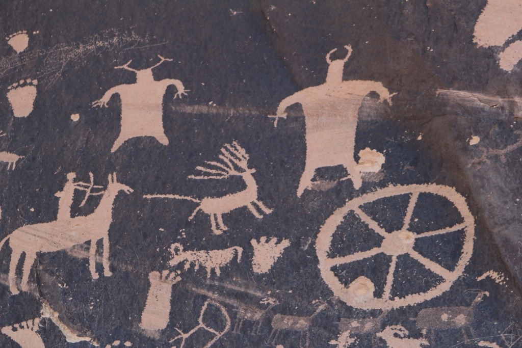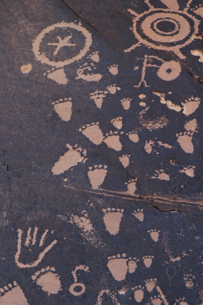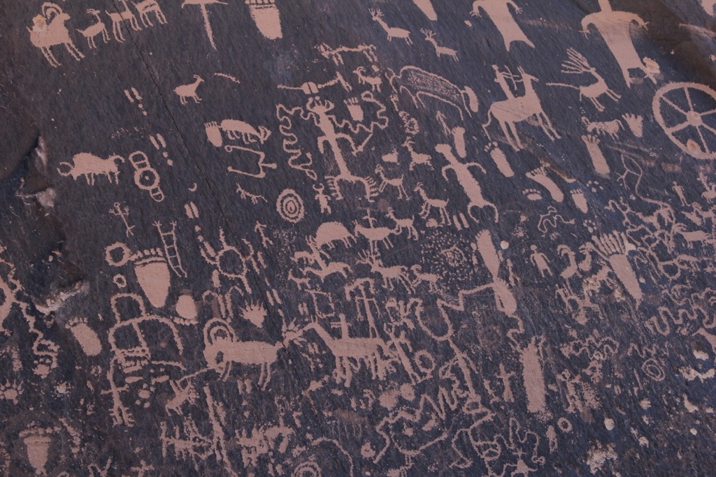 Before Moab we took a side trip to Newspaper Rock (A State Park) about 12 miles off the highway. Its a little understood set of petroglyphs used by Native Americans from about 2000 thousand years ago until 1300. Then used again by early settlers, even until some idiot in 1954 defaced it with his contribution and few other dimwits at other more recent times. But largely the “newspaper” has remained intact.