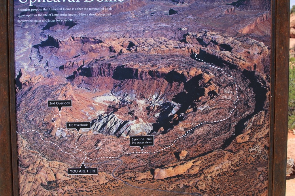 Our next stop was Upheaval Dome which is theorized to be the site of a meteor strike. Unfortunately the nearest view point was a 1 mile hike (in and another mile out) across sand and slick rock. At 101 degrees nobody was willing to make the 1 hour commitment to the walk. So we just took this picture instead and headed to Grand View.