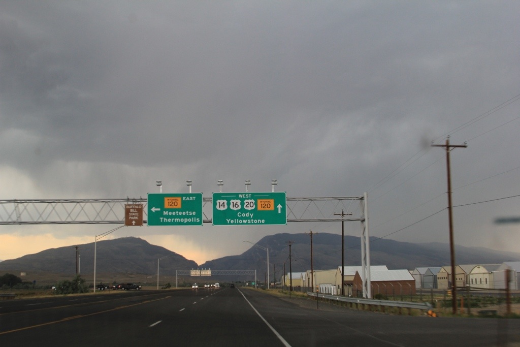A storm was brewing on the horizon. Dark clouds and lightning could be seen in the hills west of Cody. We were able to pull over at the welcome sign and get a few shots before the rains came. As we pulled into our campground (right on the highway unfortunately) it started to pour rain. Tawny and I were drenched as we tried to unhook the trailer. We left the trailer, and wet we drove into town to find someplace to eat. We ended up at the Cody Rib and Chop House and had a very good meal and some local beer before running some errands and returning to our campground. We planned on going to the Buffalo Bill Cody Museum the following morning.