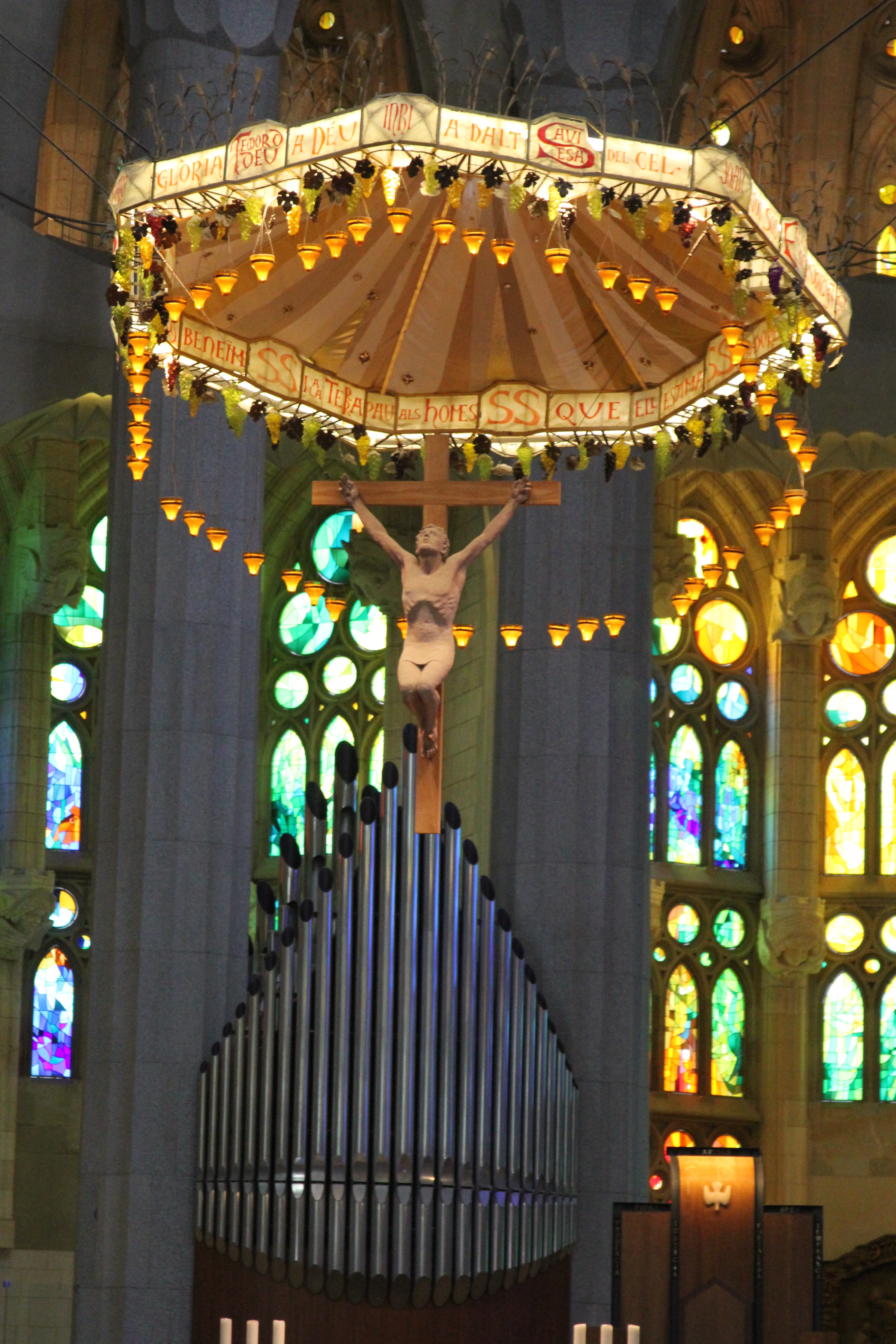 From there we headed the vast open interior like a forest with a high canopy of vaulted ceilings overhead. You are instantly awash in a colored rainbow from the stained glass and your attention is pulled to focus at one end where Christ on the cross is hung under a lantern lit parachute or canopy that seems to be ascending him to the Heavens above.