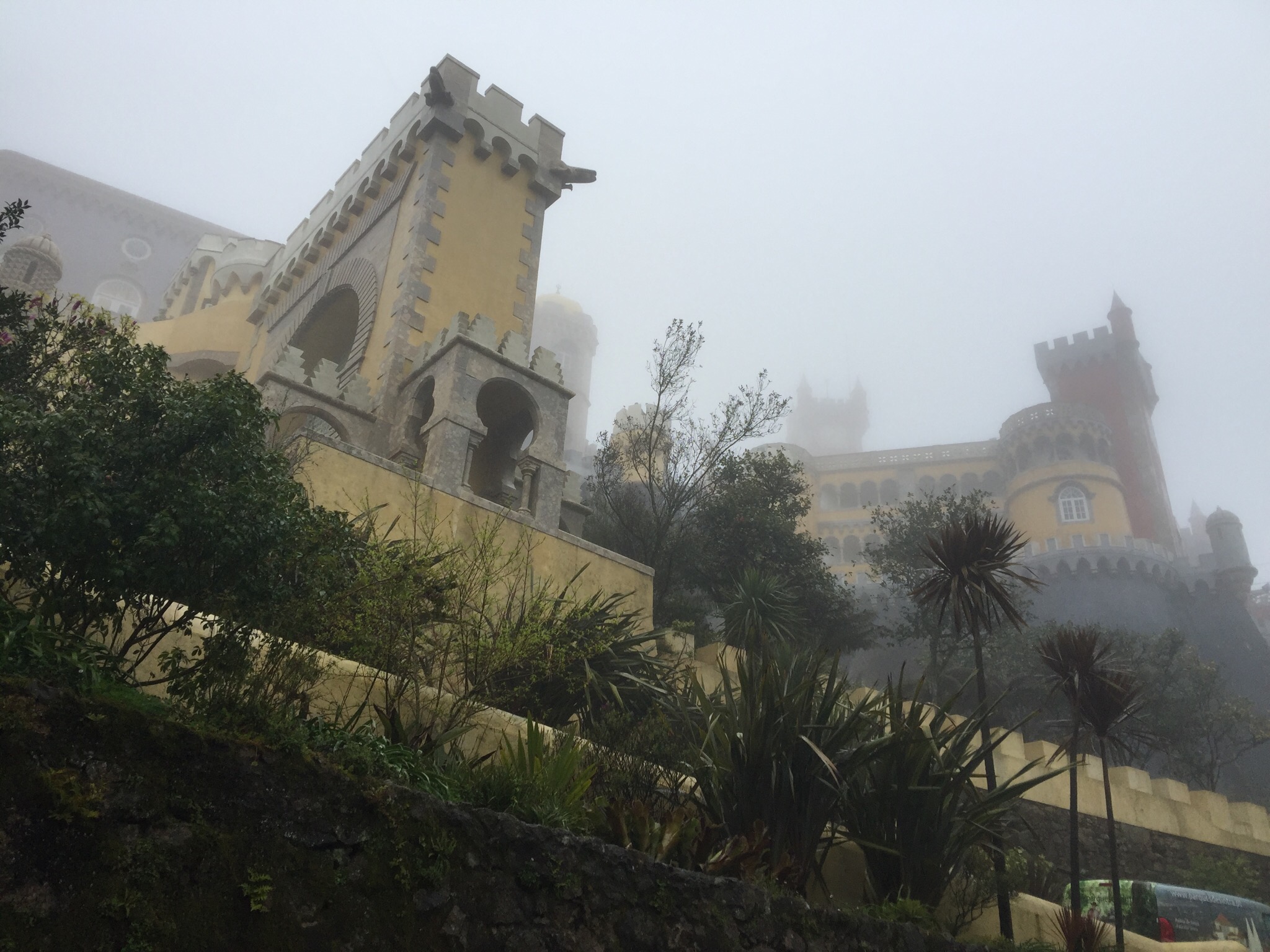 Before we knew it we were let off in the quaint town of Sintra’s Old Town in pouring (I mean buckets) of rain and wind trying to find the right bus (BTW it’s #434), buy tickets and wait in the rain for the bus to Pena Palace. By the time it arrived and we boarded we were soaked to the bone, even with our umbrellas and rain jackets.