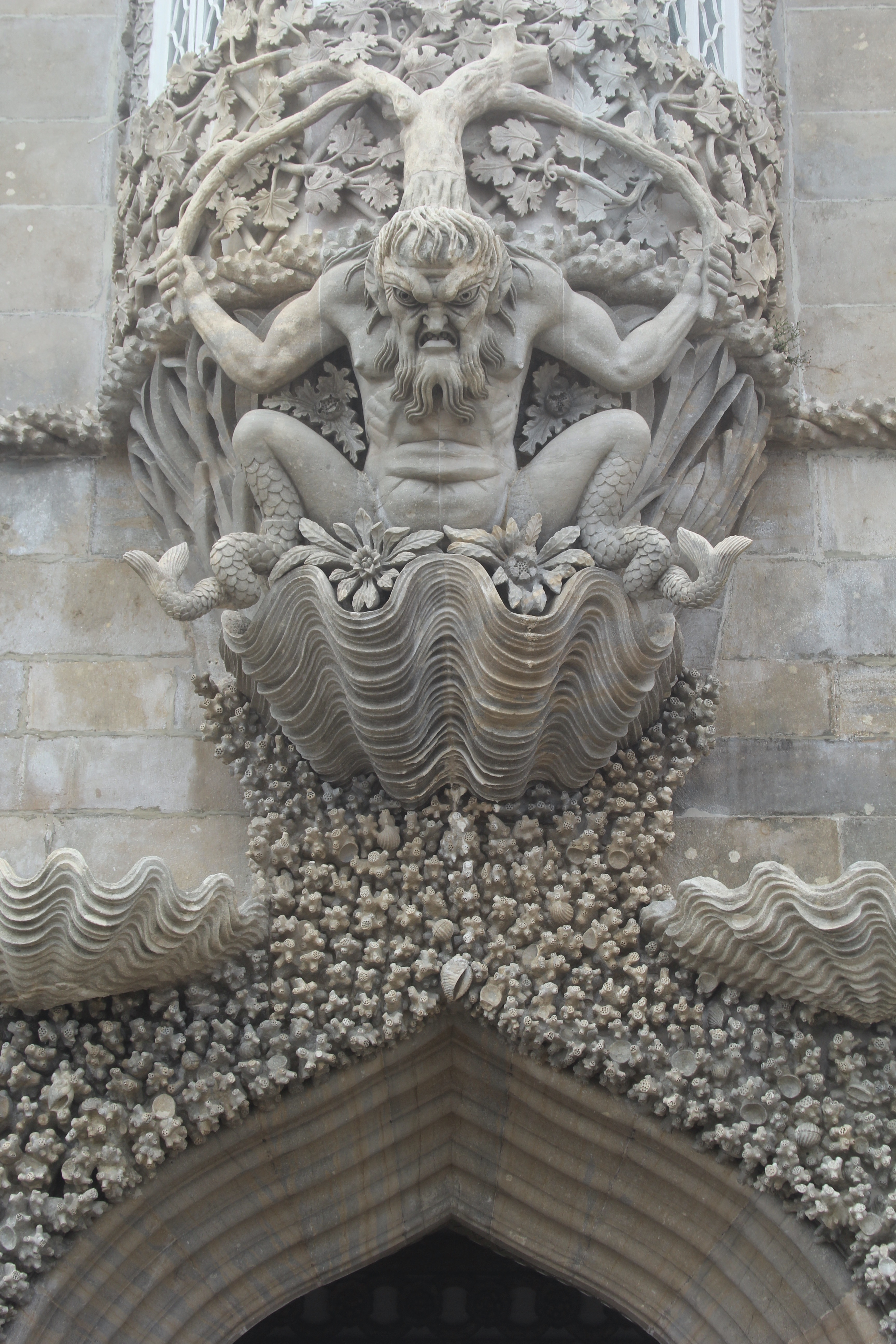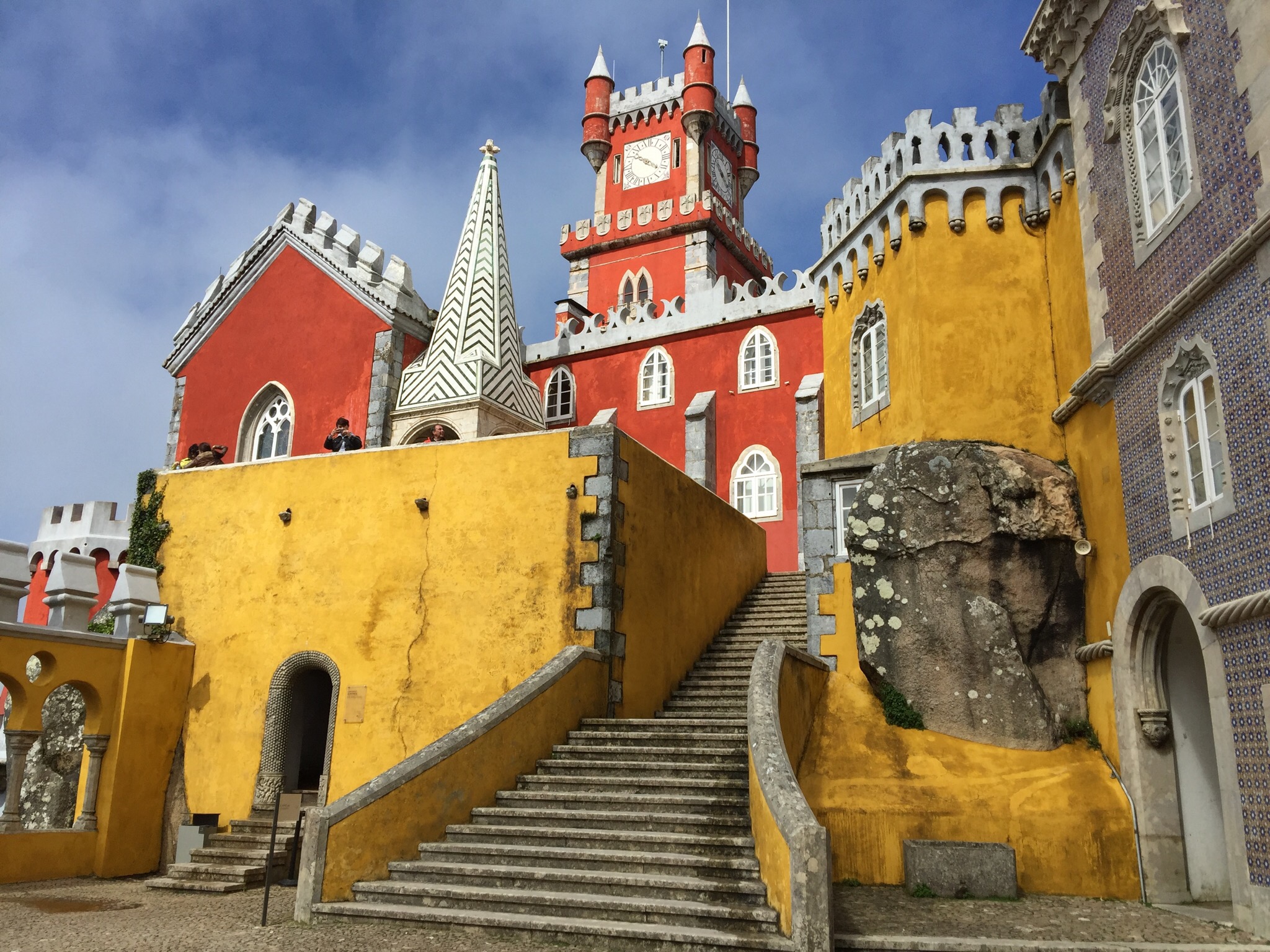 Upon arrival we asked about tours, they had one in English in about an hour. We decided to get some lunch in the cafeteria while we waited. It was undoubtedly our worst meal of the trip. But it was worth the wait. The tour started just as the rain ended. And while we’re were still in the fog and clouds and wind much of the tour was inside. The guide was informative and engaging and we were riveted to hear the tale of how Prince Ferdinand (cousin to Bavaria’s “Mad” King Ludwig) and of Prince Albert became enthralled with the Moorish castle and monastery located there. As luck would have it the monastery was for sale and he bought the lands and spent much of his life (becoming King after marrying Queen Maria II of Portugal). He didn’t bother much with politics and spent most of his life as a patron of the arts building this palace for his love Queen Maria). Unfortunately she died bearing perhaps the 11th child and years later he scandalously married Elisa Hensler (a highly educated and artistic (ceramics and opera) Swiss schooled in America – who was also secretly a single mom raising her “niece”. Fascinating people!