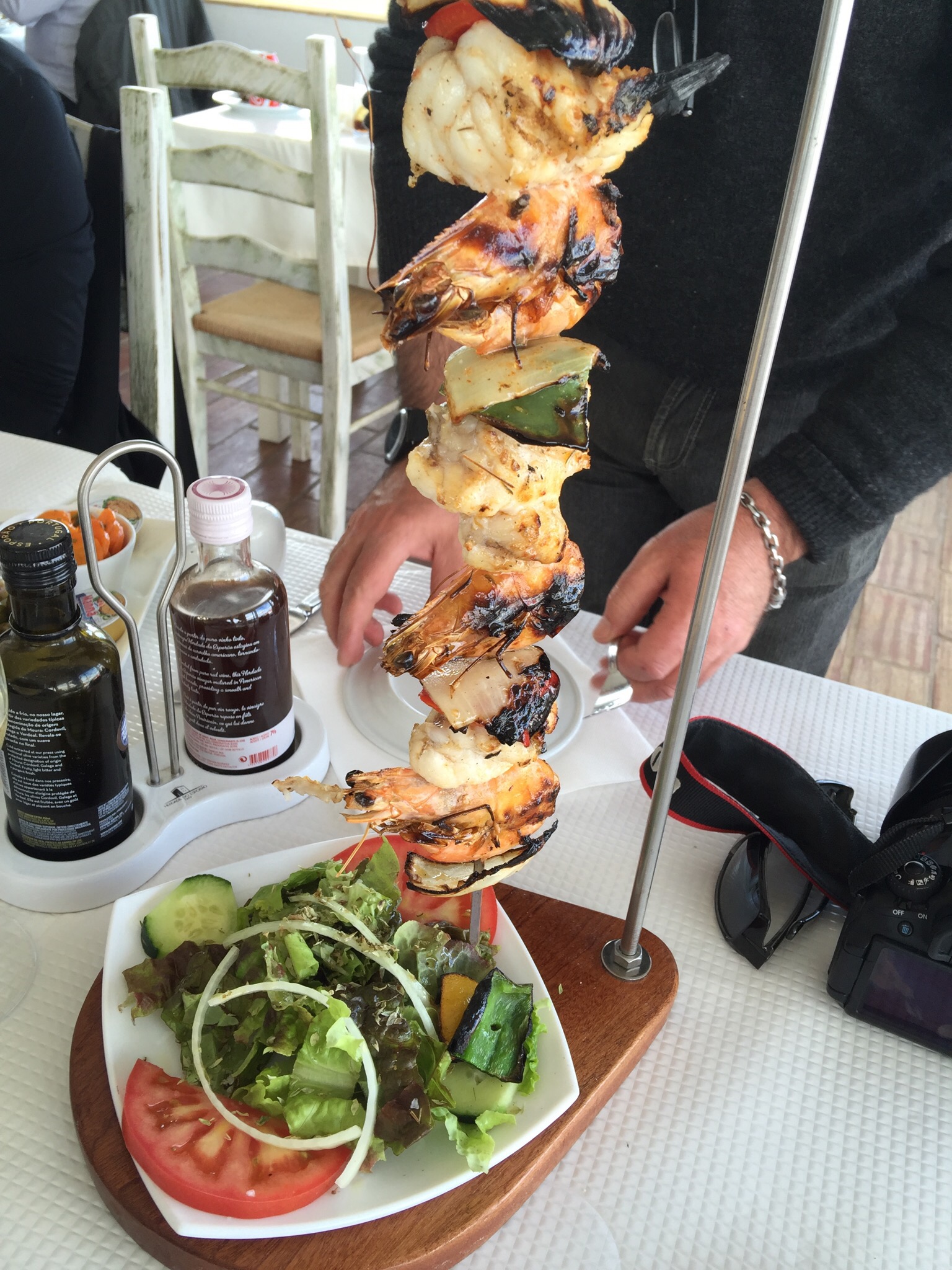 We ordered a plate of prawns in a spicy sauce, a dangling skewer of mixed grill of prawns and monkfish, as well as steak and homemade fries. By far this was the best meal in Portugal to date.