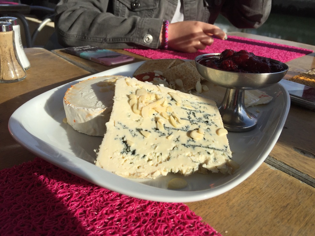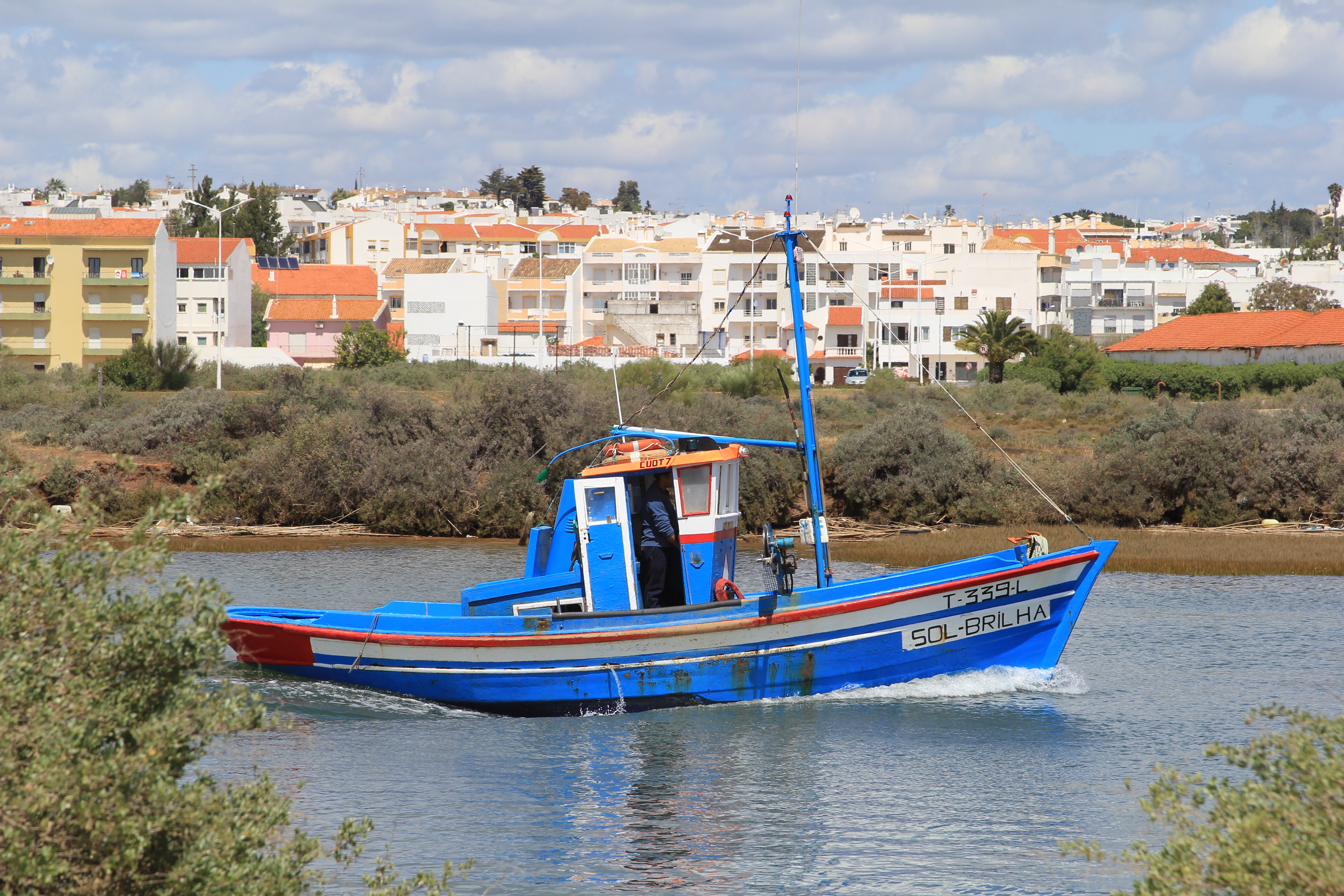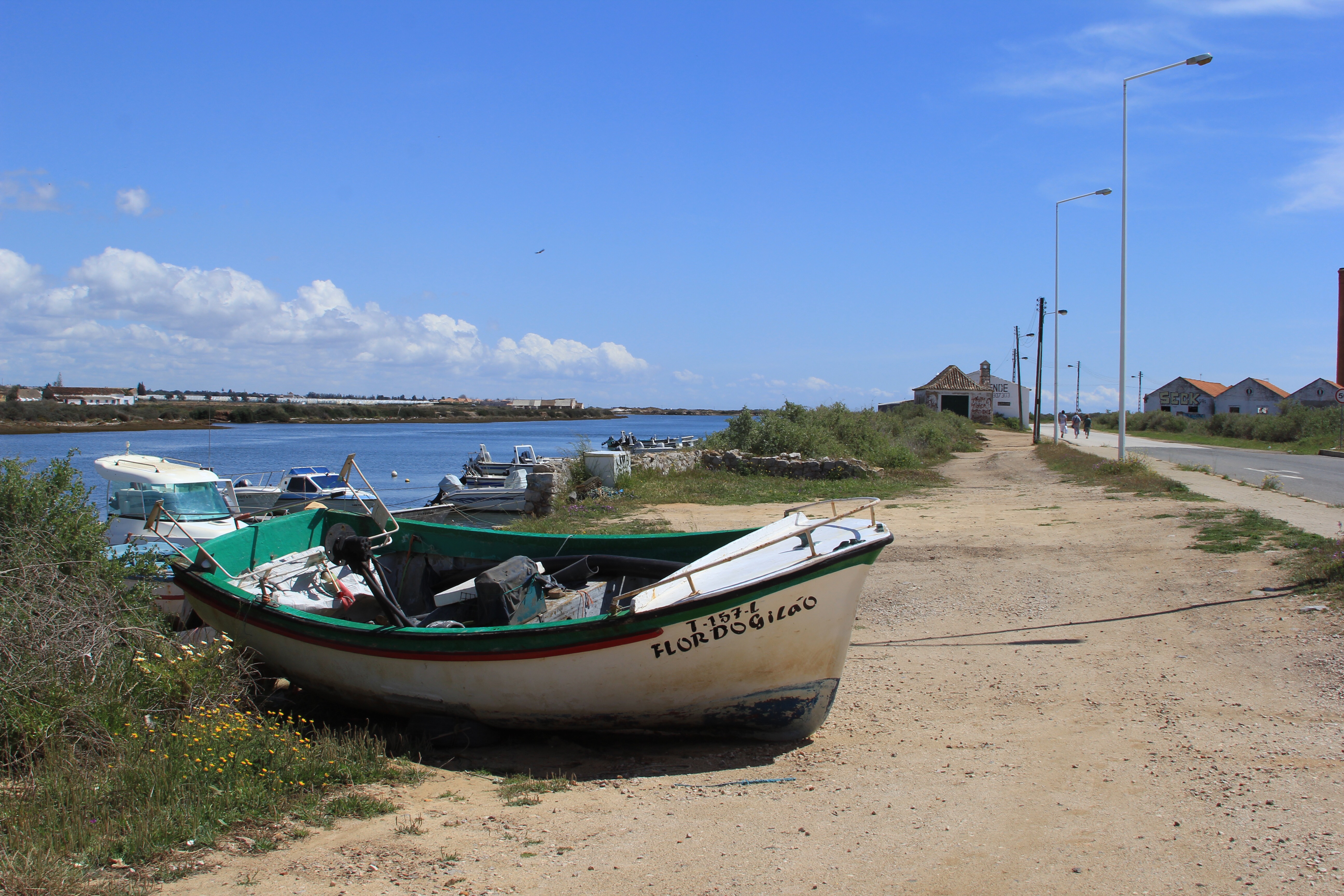 For lunch Luís (via FB) had recommended a friend’s restaurant called 4 Aguas out where you catch the boats to the beaches. We started walking out of town towards the marina and the salt flats on the horizon (they produce an excellent flor de sal in Tavira and all along the Algarve), and passed the fishing boat returning from an early morning sailing.