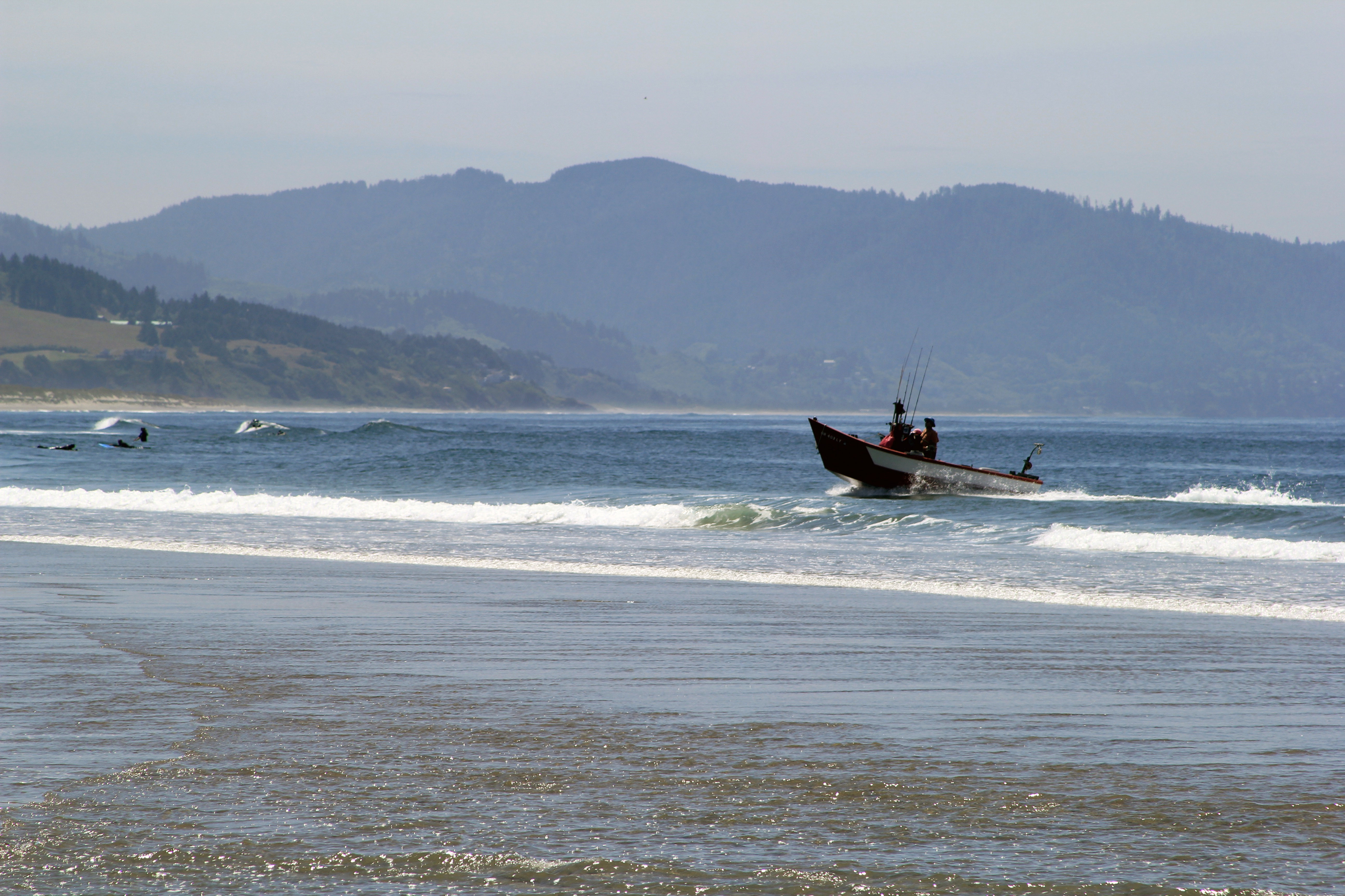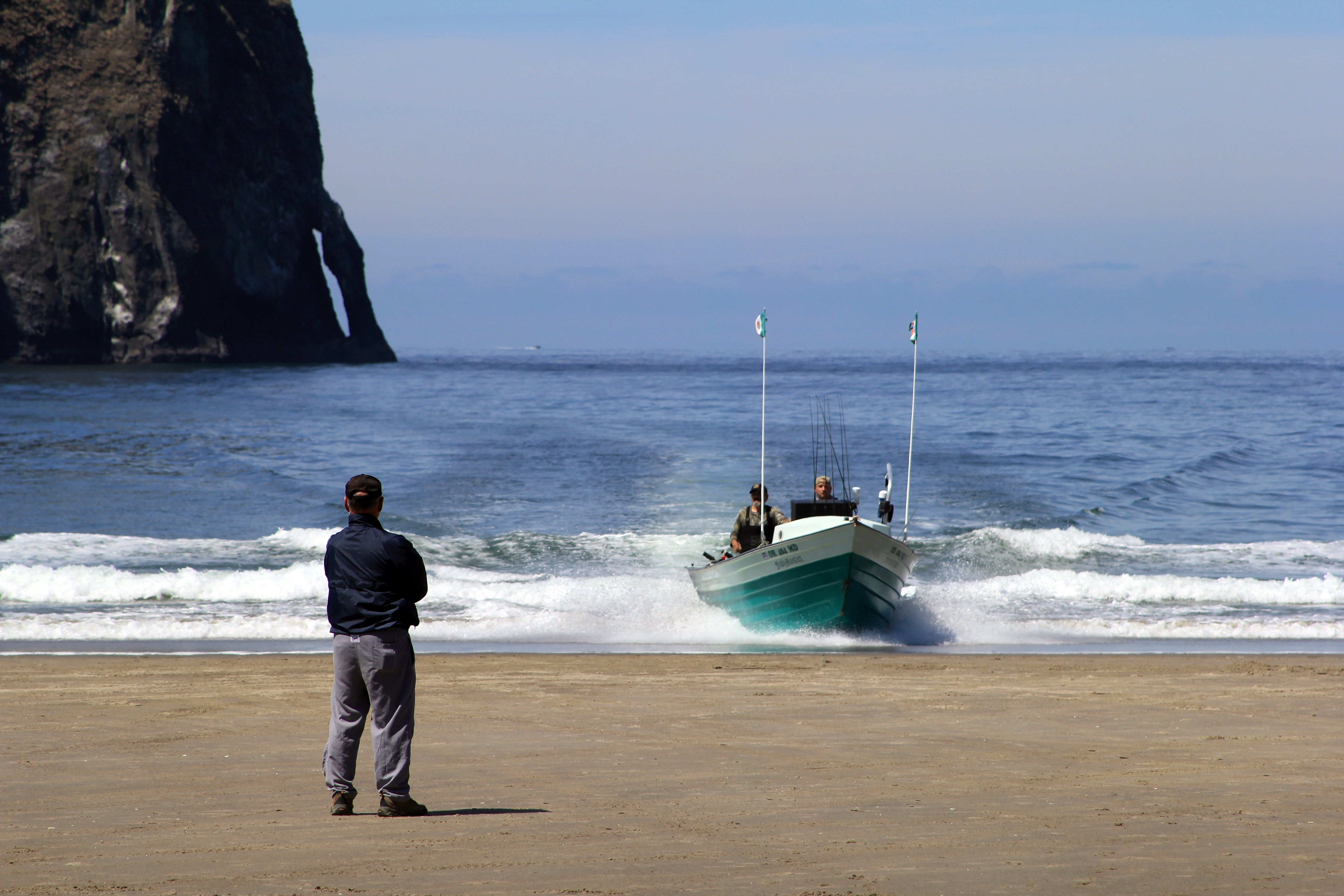 We had been told to watch out for the returning dory boats of Pacific Beach. “Stay clear of the boats when they are landing on the beach, listen for the horns and move out of the way. Dory’s don’t have breaks”. The boats are known to rush the beach at high speed, catch a wave and land well onto the beach so awaiting vehicles with trailers can winch them back home. The 100 year old traditional fleet of uniquely flat bottomed boats heads out most mornings from the reserved stretch of beach between Haystack Rock and the Giant Sand Dune of Pacific City and returns on the midday tide.