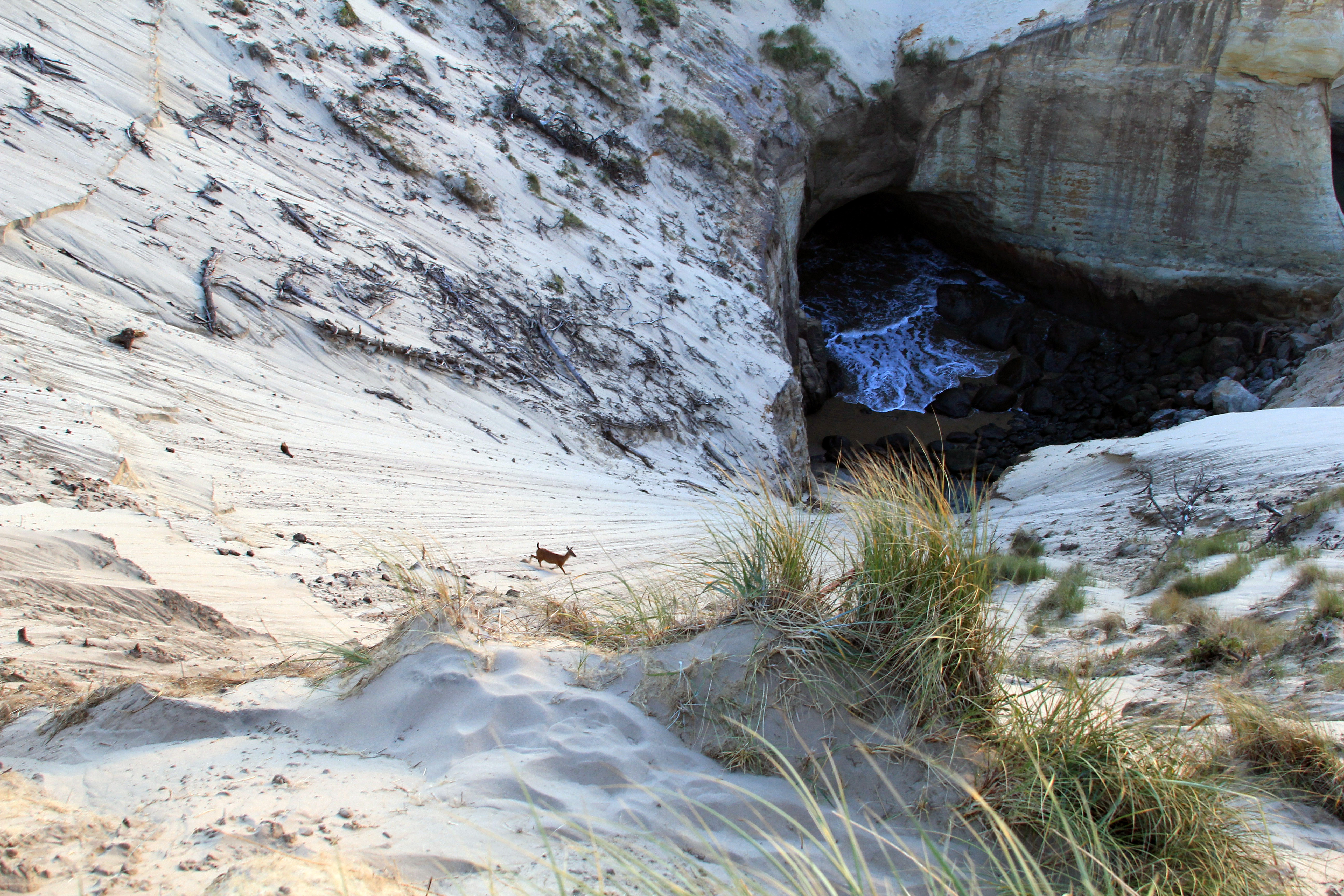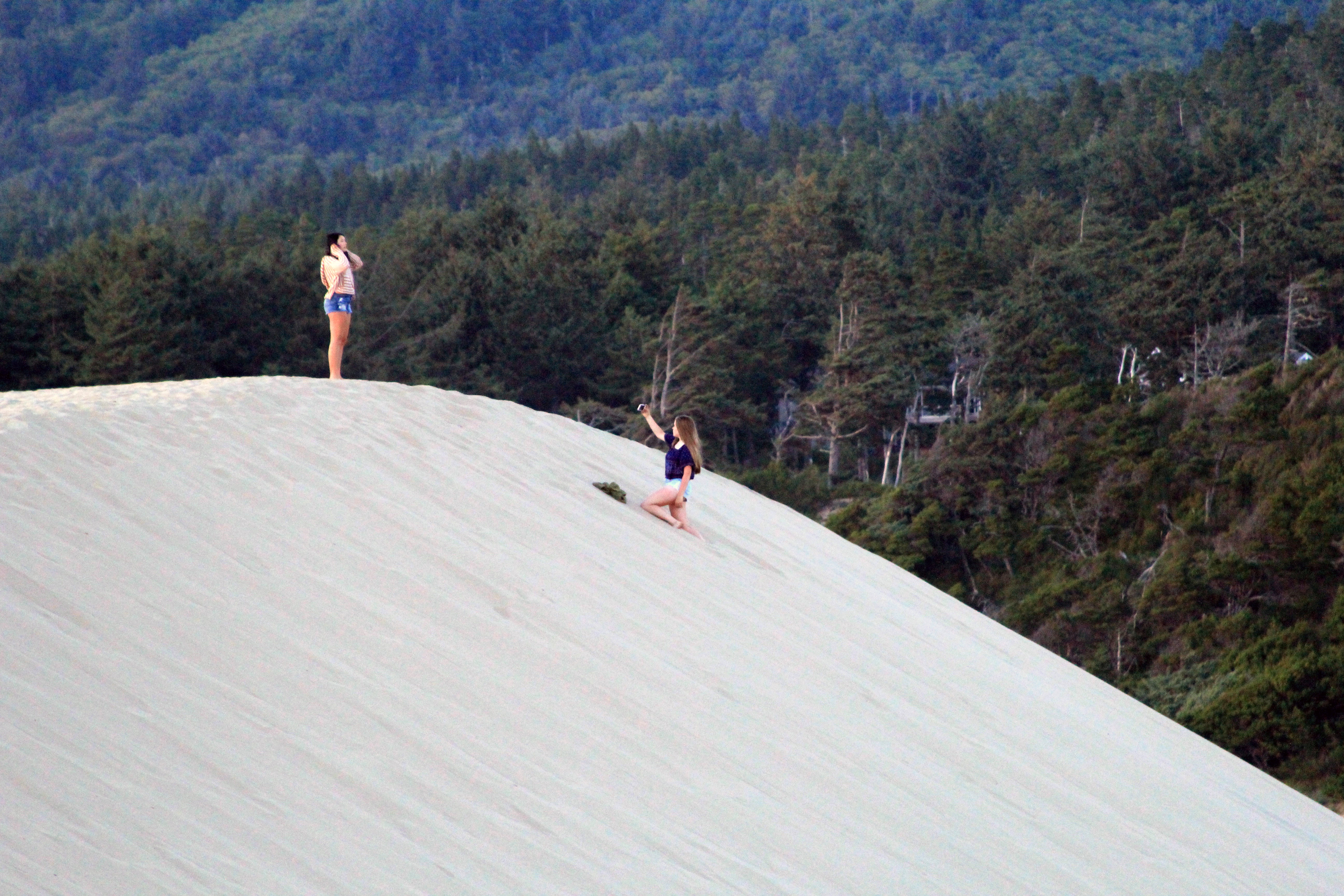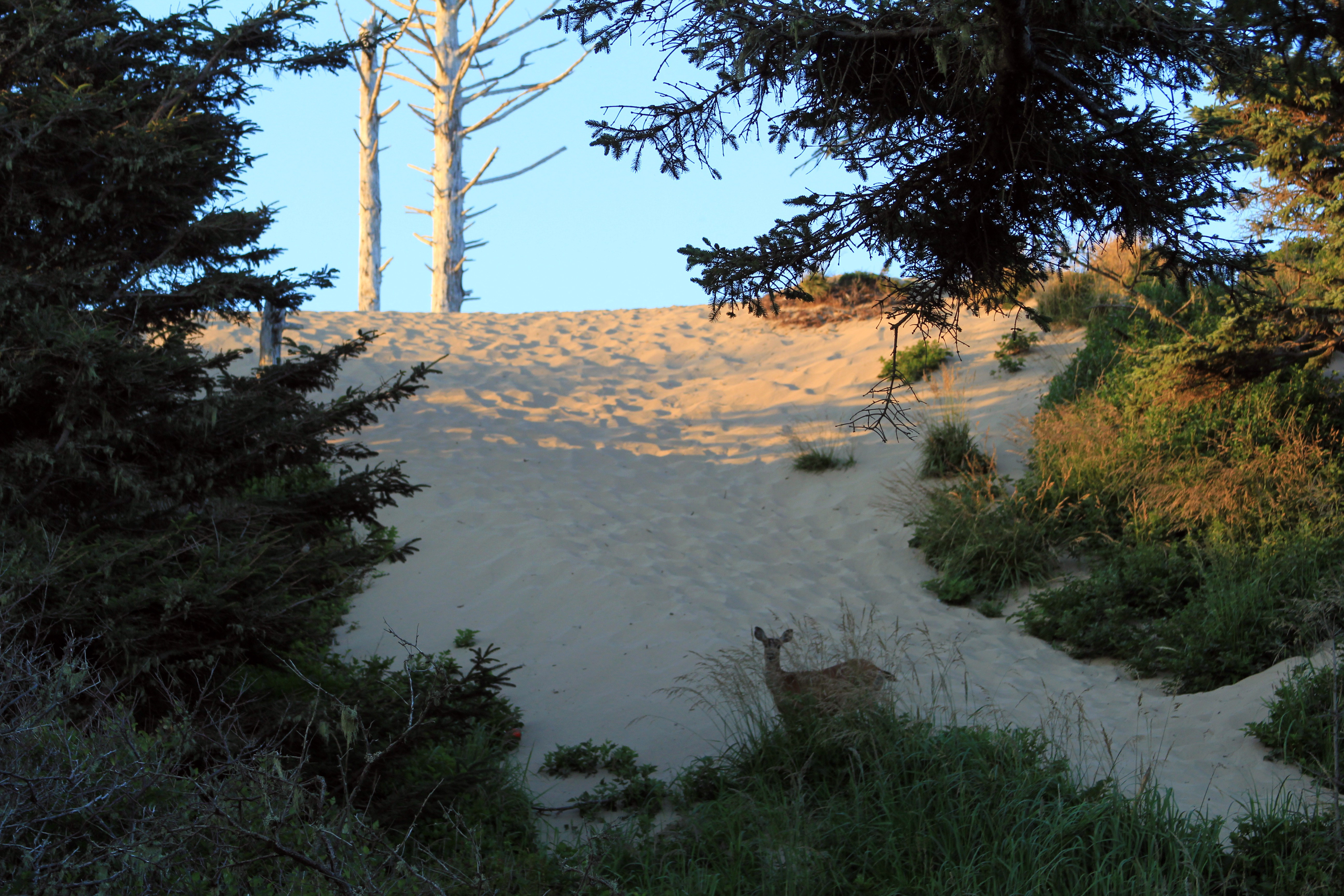 While I retraced my steps from earlier in the day Clara and Morgayne decided to take on the steep sand-walled ascent. The views on the way were similar to those earlier in the day, but bathed in magic-hour light. As I walked through a small wooded area towards the top of the dune I encountered a deer making its way home for the evening.