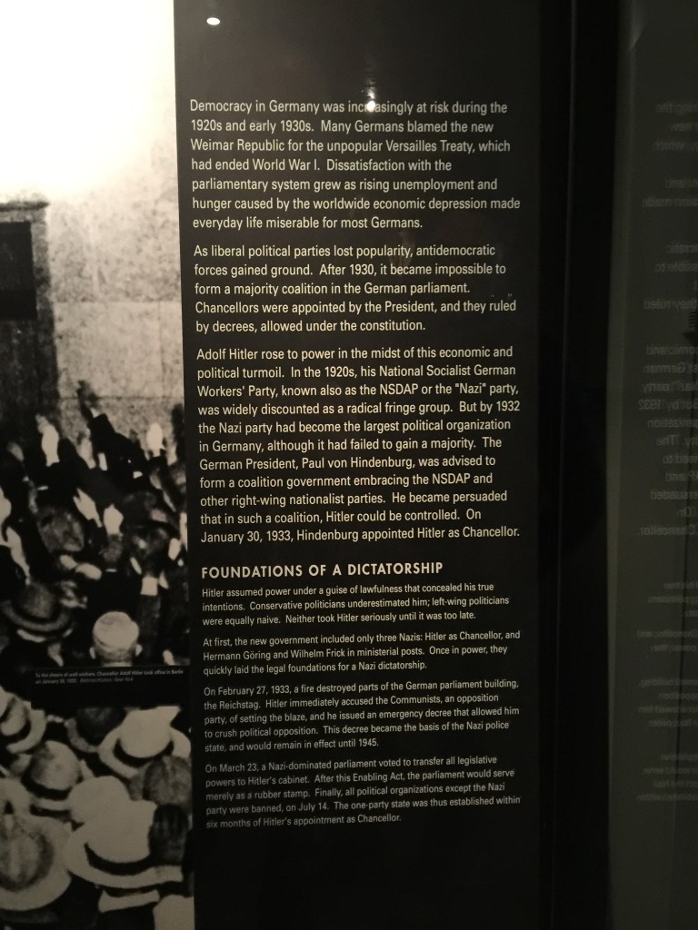 Watch this video of Hitler’s rise to power from the museum. Then read these descriptions of Hilter’s rise to power but exchange some of the words with modern characters and circumstances and then tell me it doesn’t scare the shit out of you.