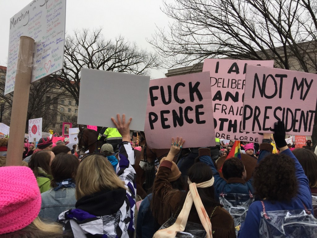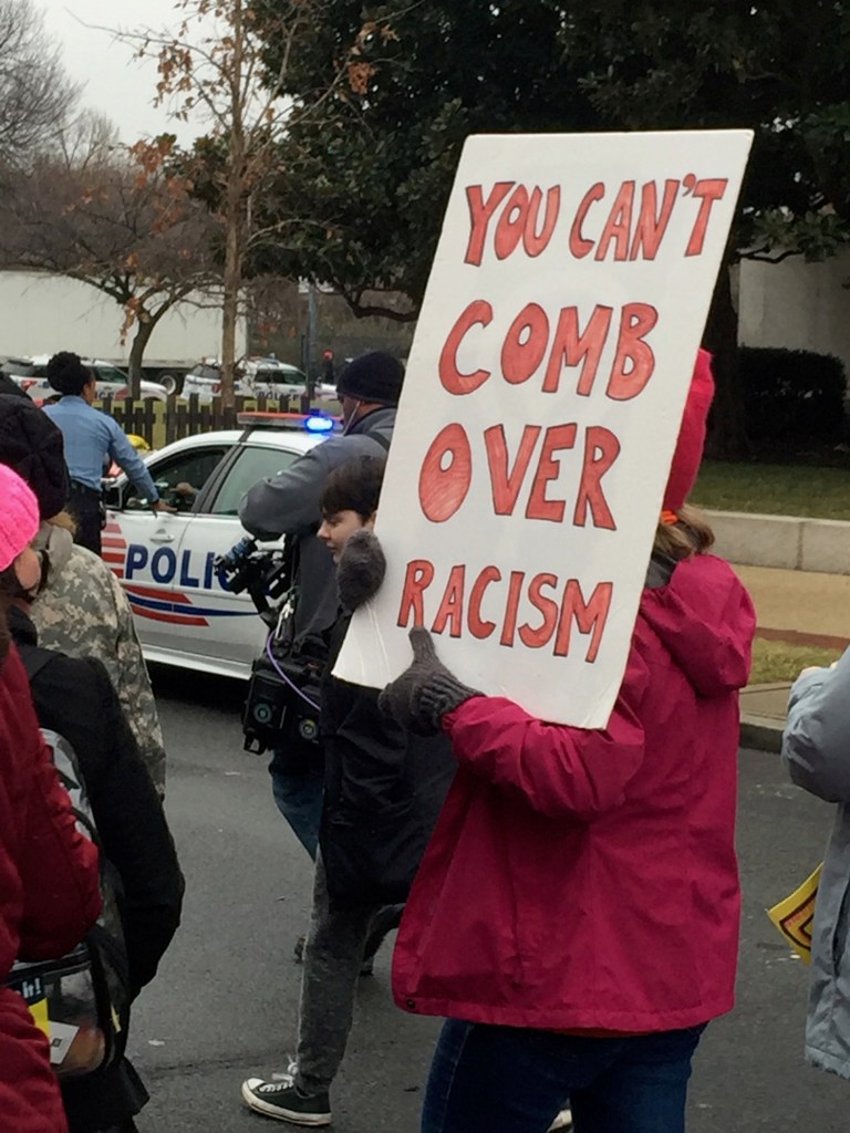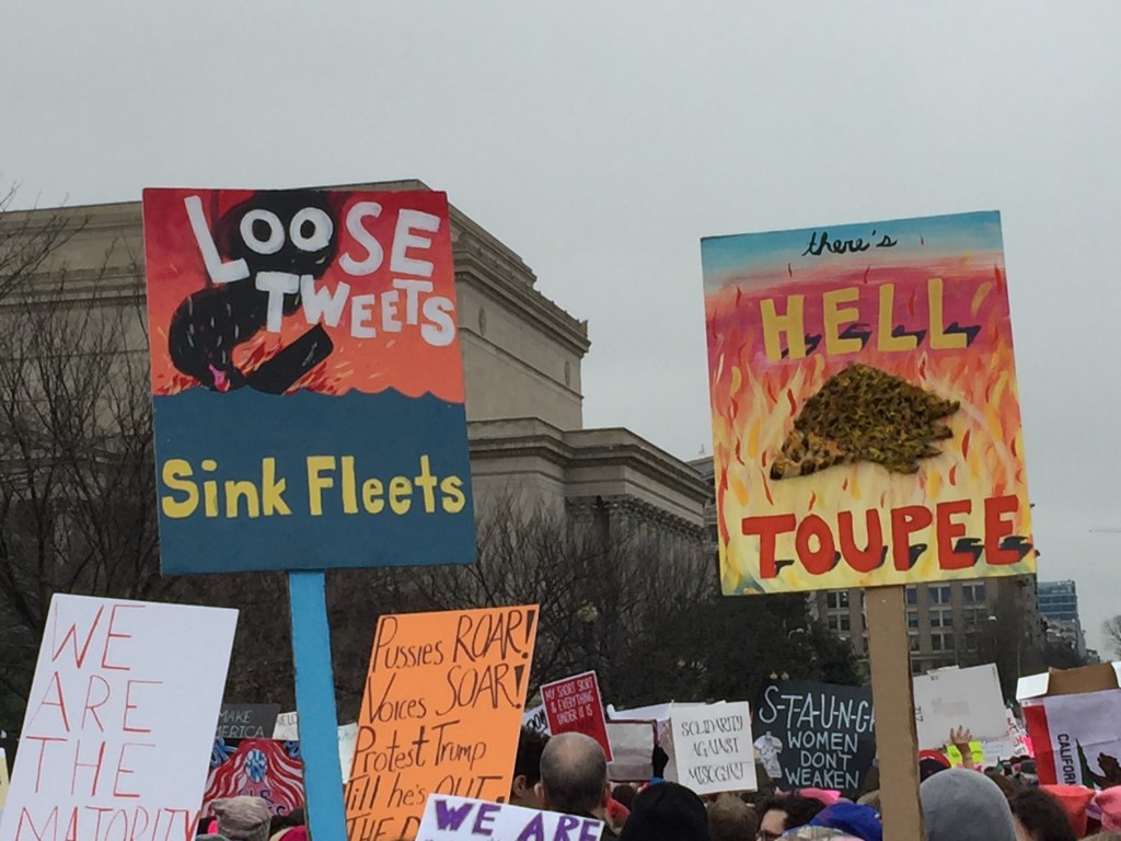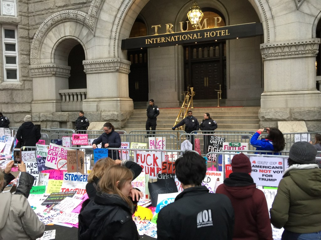 We got stuck at 7th between Madison and Constitution for a long time trying to get off the mall and march down Constitution towards the White House. It took a long time but we finally got through. We then found ourselves at Trump International Hotel where thousands of people had started dropping off their protest signs.