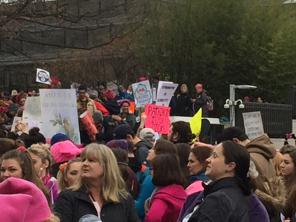 The presence of Trump supporters between inauguration day and Women’s March day was the difference between night and day. You couldn’t look anywhere without seeing a pink hat and we had a 30-minute walk from our hotel to the Mall. We headed down there as the crowds gathered. It was so crowded at 9 am we couldn’t get to the starting point of the march (which was to start at 1:15 but didn’t start until well after 2 pm). We got to the corner of 4th and Jefferson and it was a wall of humanity. We stayed put.