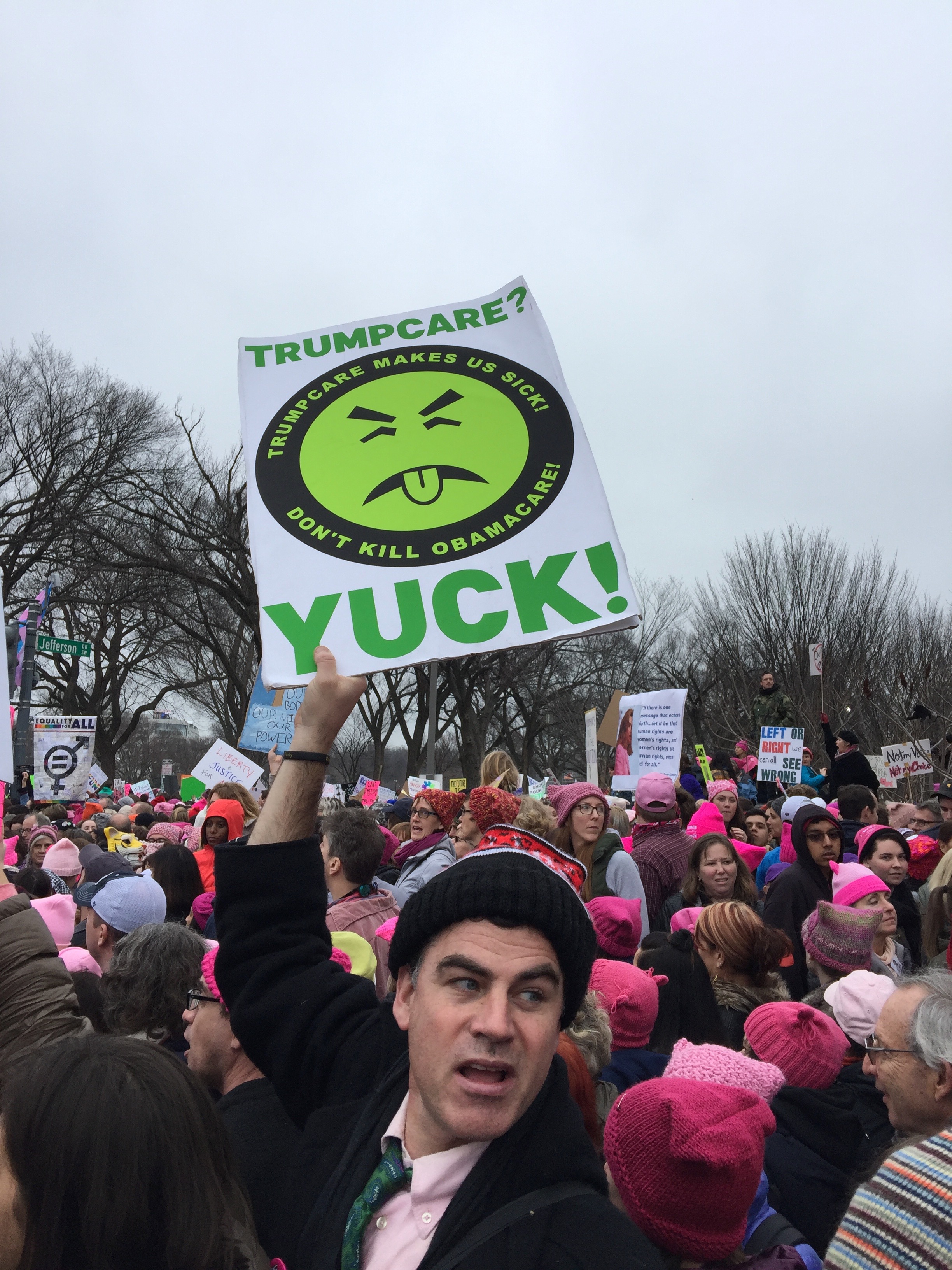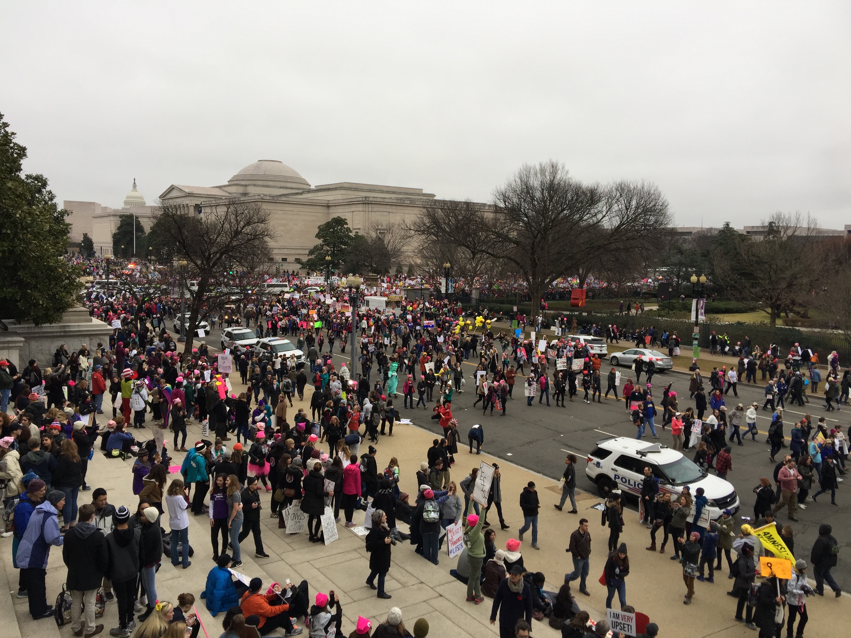 The presence of Trump supporters between inauguration day and Women’s March day was the difference between night and day. You couldn’t look anywhere without seeing a pink hat and we had a 30-minute walk from our hotel to the Mall. We headed down there as the crowds gathered. It was so crowded at 9 am we couldn’t get to the starting point of the march (which was to start at 1:15 but didn’t start until well after 2 pm). We got to the corner of 4th and Jefferson and it was a wall of humanity. We stayed put.