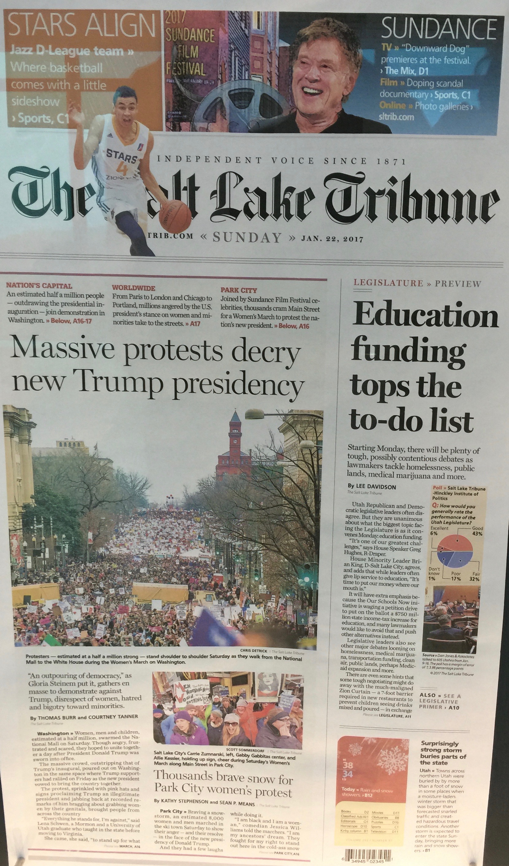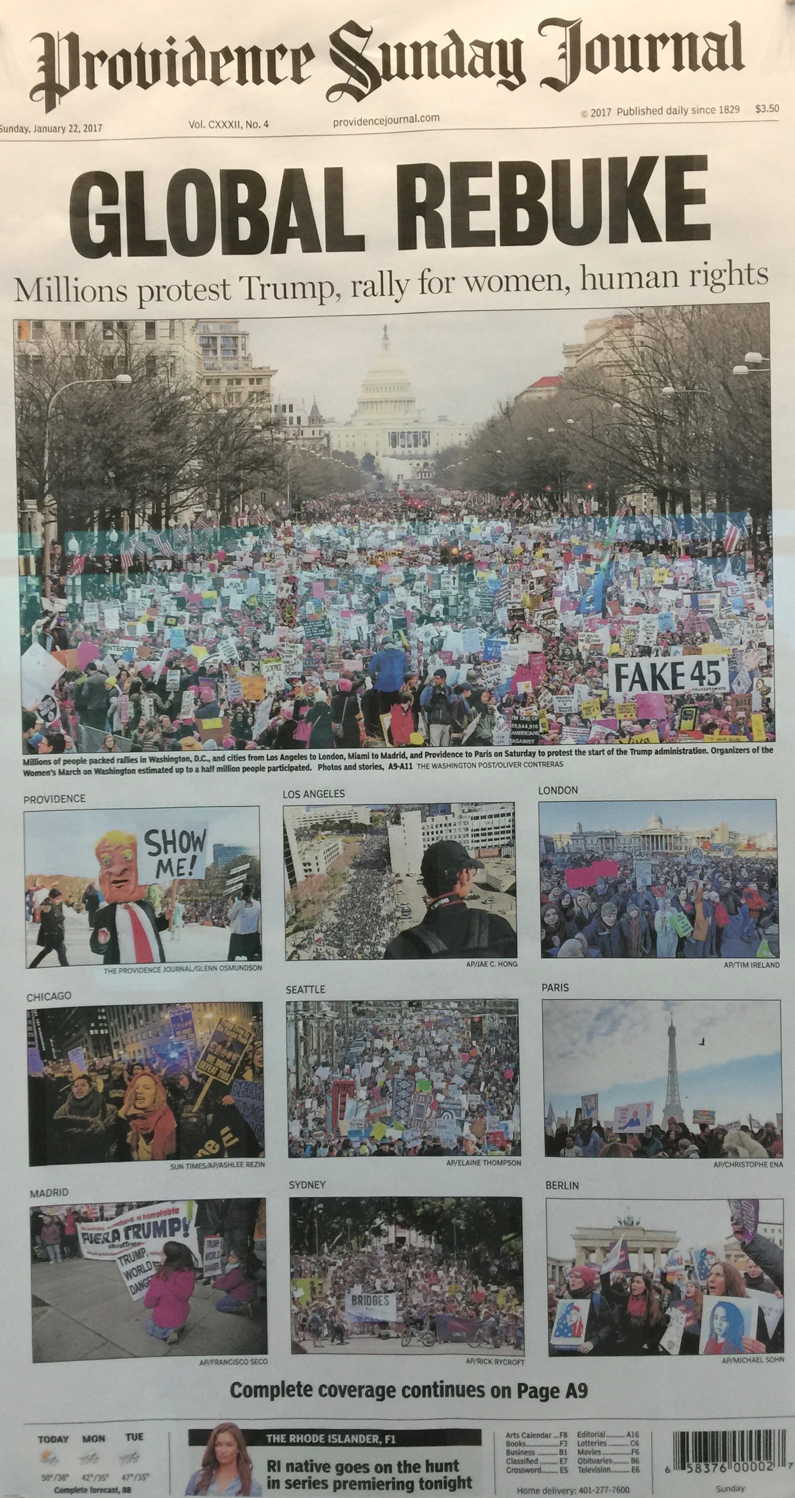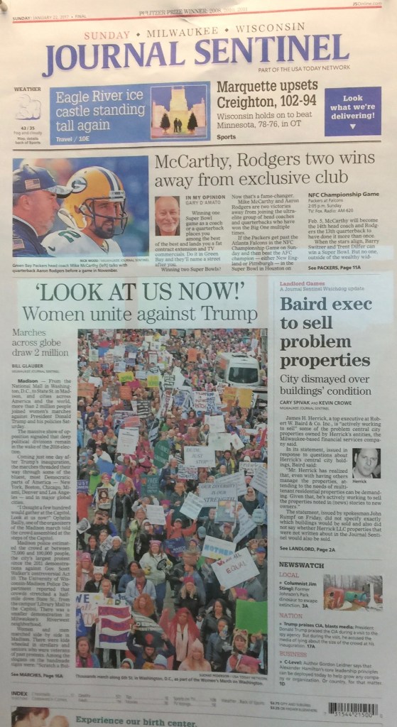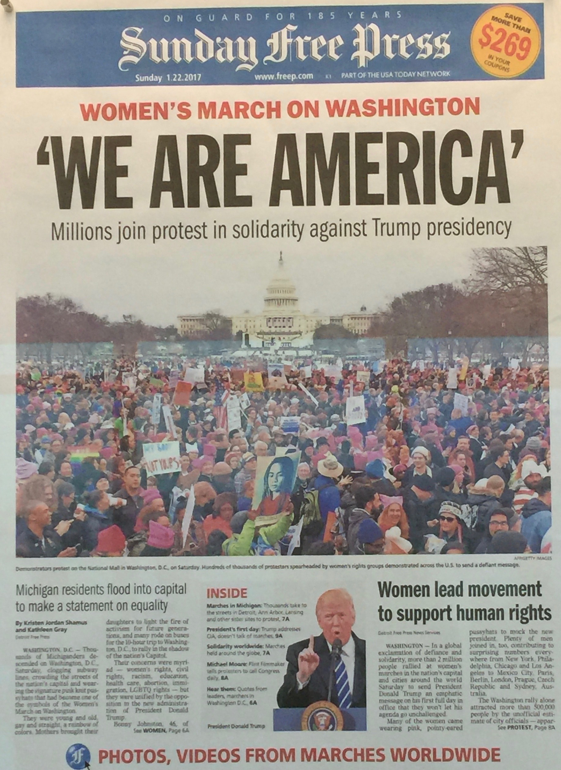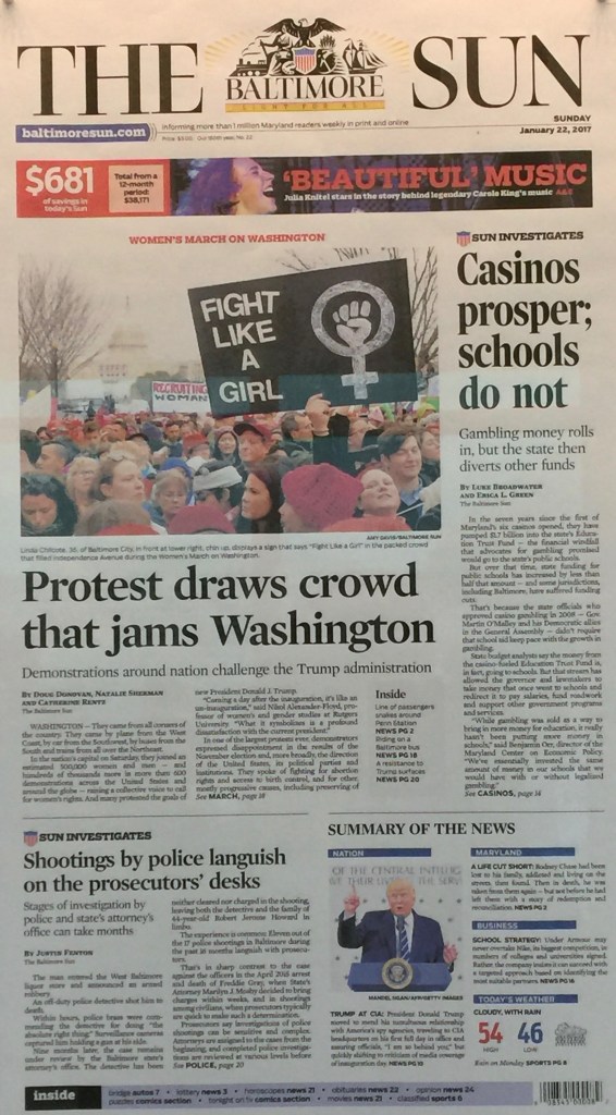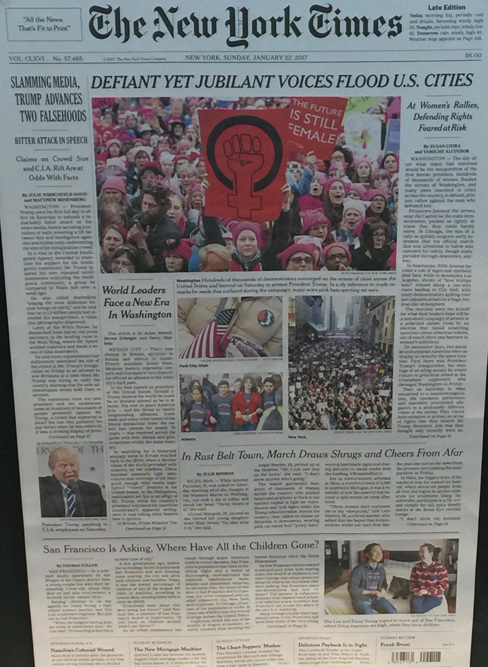 We were with hordes of humanity (estimates from 600k – 1m) marching in DC who were loving, enthusiastic, and united. It was a great day only made better by meeting some friends we haven’t seen for years at another José Andrés restaurant – Zaytinya. We had a great dinner (the restaurant was packed! The waiter telling us it had been near empty all week but today had been a madhouse). Then we stayed up late with our friends drinking in our room and watching Saturday Night Live. Brilliant! In particular, the segment on Kellyanne Conway was amazing. It was shocking to see her on Meet the Press the next morning telling Chuck Todd that Sean Spicer’s first official announcement as White House Press Secretary was presenting “Alternative Facts”. You may know these by their more common name: Lies. Defending Sean Spicer blatant lying to the whole world about the size of Trump’s “hands” inaugural attendance, (puny when compared to the Women’s March) was just mind-numbing. Not to mention Trump’s visit to the CIA during the Women’s March to declare war on the media and complain about his size.