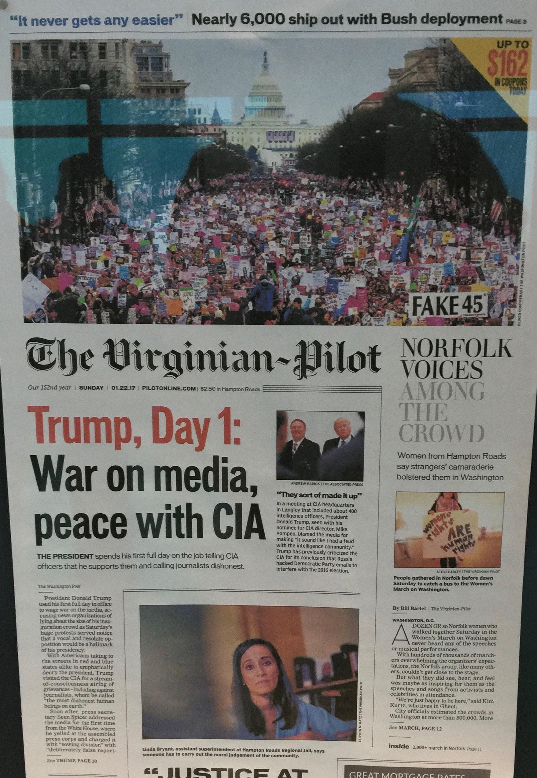 We didn’t know what to do with ourselves. But we quickly figured it out. We went to the Newseum. The Newseum focuses on the First Amendment (the part about a free press) as well as the history and role of a free press in our Democracy. Freedom of speech gives Trump the freedom to lie to us, but also gives us the responsibility and moral authority to call him out for it.