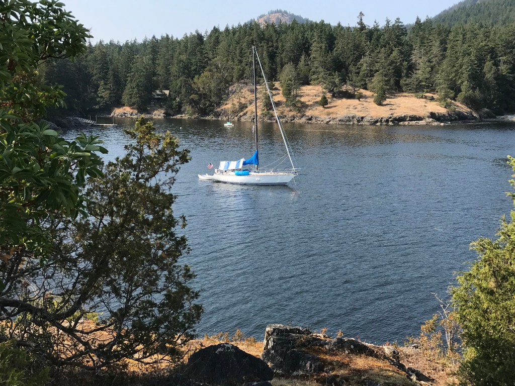 We never intended to finish, but the direction of the race down Guemes Channel was the direction we were going and the only planned agenda we had. Pangaea needed simply to start the race so she’d continue to earn points for the Anacortes Yacht Club summer series, of which this race was included. We left the race as the fleet rounded Guemes and kept our heading straight on across Rosario Strait towards Lopez Island. While it was a sunny day, the Strait brought a biting cold wind off the ocean, but we found shelter from it in our night’s anchorage in Swifts Bay.