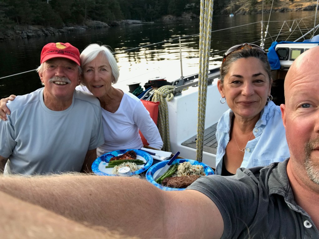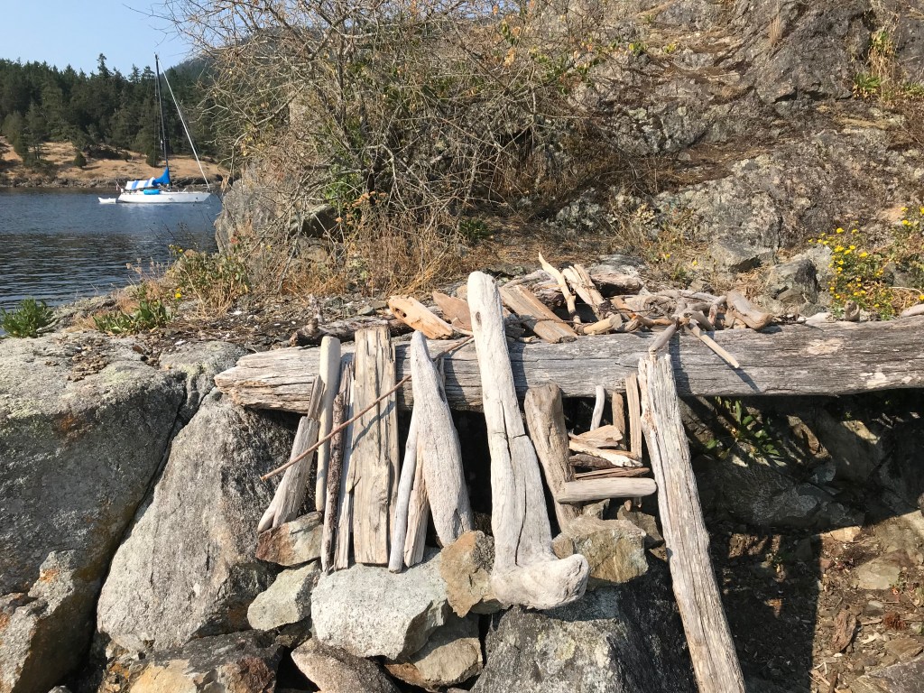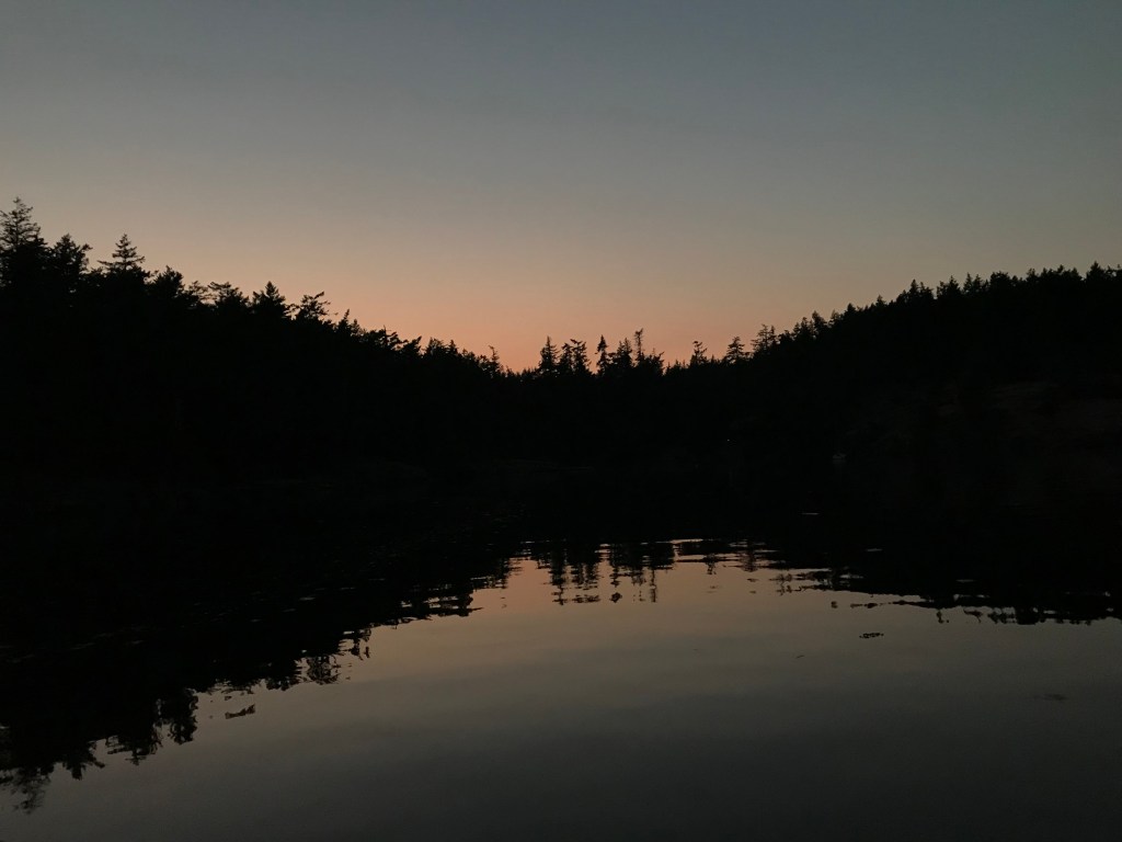 While West Beach Resort was only a short 5 miles by road, it was several hours by sailboat and more than we could take on that late in the day that was growing hotter. We decided to spend the steamy afternoon at nearby Massacre Bay and find anchorage behind Skull Island for the night. Yes, you read that right. In 1858 a group of northern Coast Salish tribes wiped out a seasonal Lummi camp at the head of West Sound. The resulting namesakes for the bay and several small islands (including Victim Island) entomb in our memories the bloody event. We escaped the heat by exploring the shoreline by kayak and resting ourselves under the shade of the “African Queen” canopy.