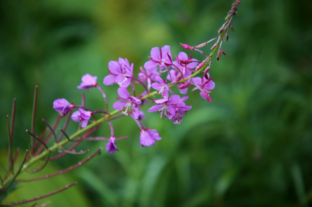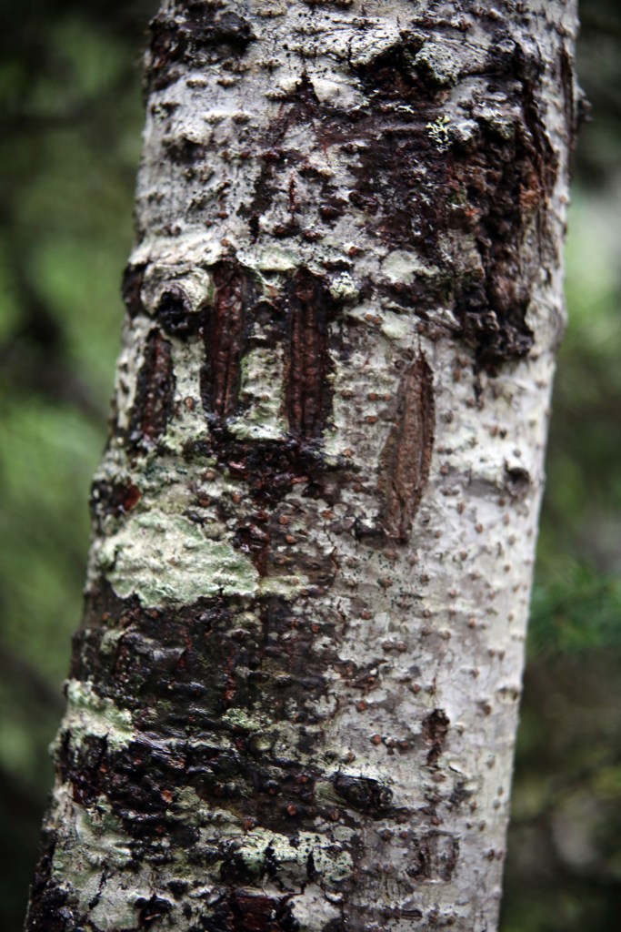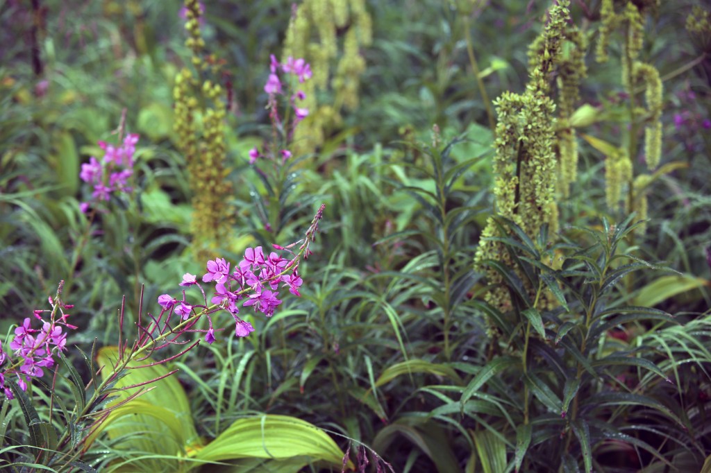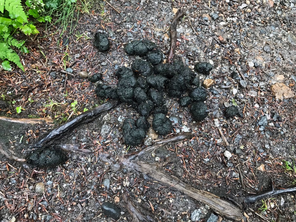We started our hike through easy flowered meadows of fireweed and Devil’s club and lush and dampened green temperate rainforest trails before starting a more arduous ascent into the sub-alpine region. Along the way, we were reminded of the wilds in which we hiked by the bear scat and bear markings on a tree along the trail.