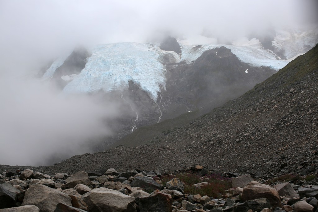As we climbed the terrain changed and became steeper and more rugged. We traded the muddy trail of the valley below for rocky gravel and boulders. The trail all but disappeared and we were left to follow in single file footsteps of our guide Rylan towards Laughton Glacier.