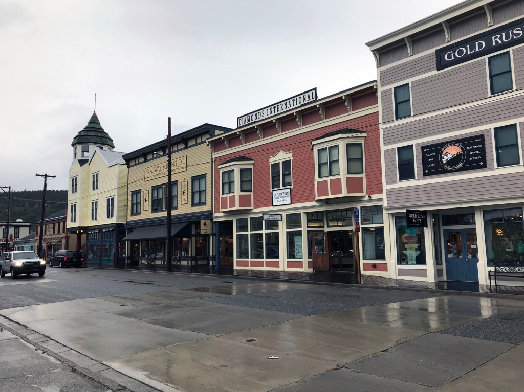We walked through downtown Skagway (population ~1000) to meet our train on the White Pass & Yukon Route Railway. While once a bustling gold rush waypoint, today Skagway has little reason to exist beyond inclusion in the Klondike Gold Rush National Historical Park and its catering to hundreds of thousands of visitors each summer. Many come simply to ride the precariously perched narrow gauge railroad into the Yukon dating from 1899. The more foolhardy hear The Call of the Wild, abandon the tracks, and venture deeper into the last frontier.