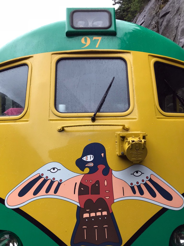 The train slowly wound its way up White Pass over narrow trestles and past varied signpost stops, such as Denver where you can spend the night in a boxcar by the side of the tracks and hike various trails near Skagway. Our stop was a little over 14 miles up the pass where we disembarked in the rain (but less wind) and to start our hike.