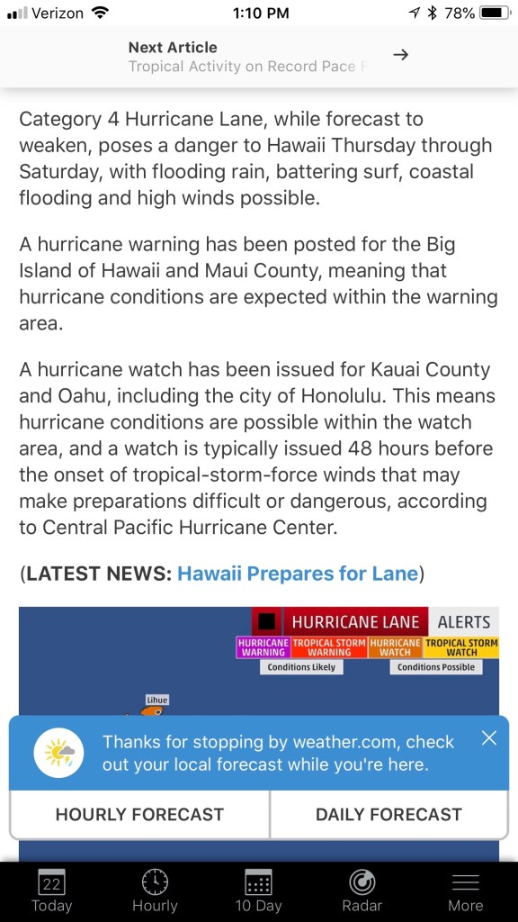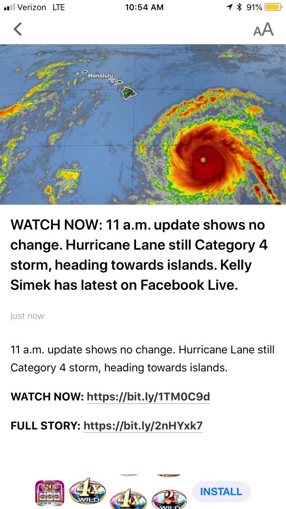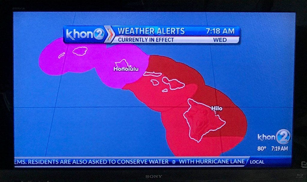Today we awoke to emergency alerts on our phones. I flipped on the TV and immediately saw the emergency alert system broadcasting this about Hurricane Lane: