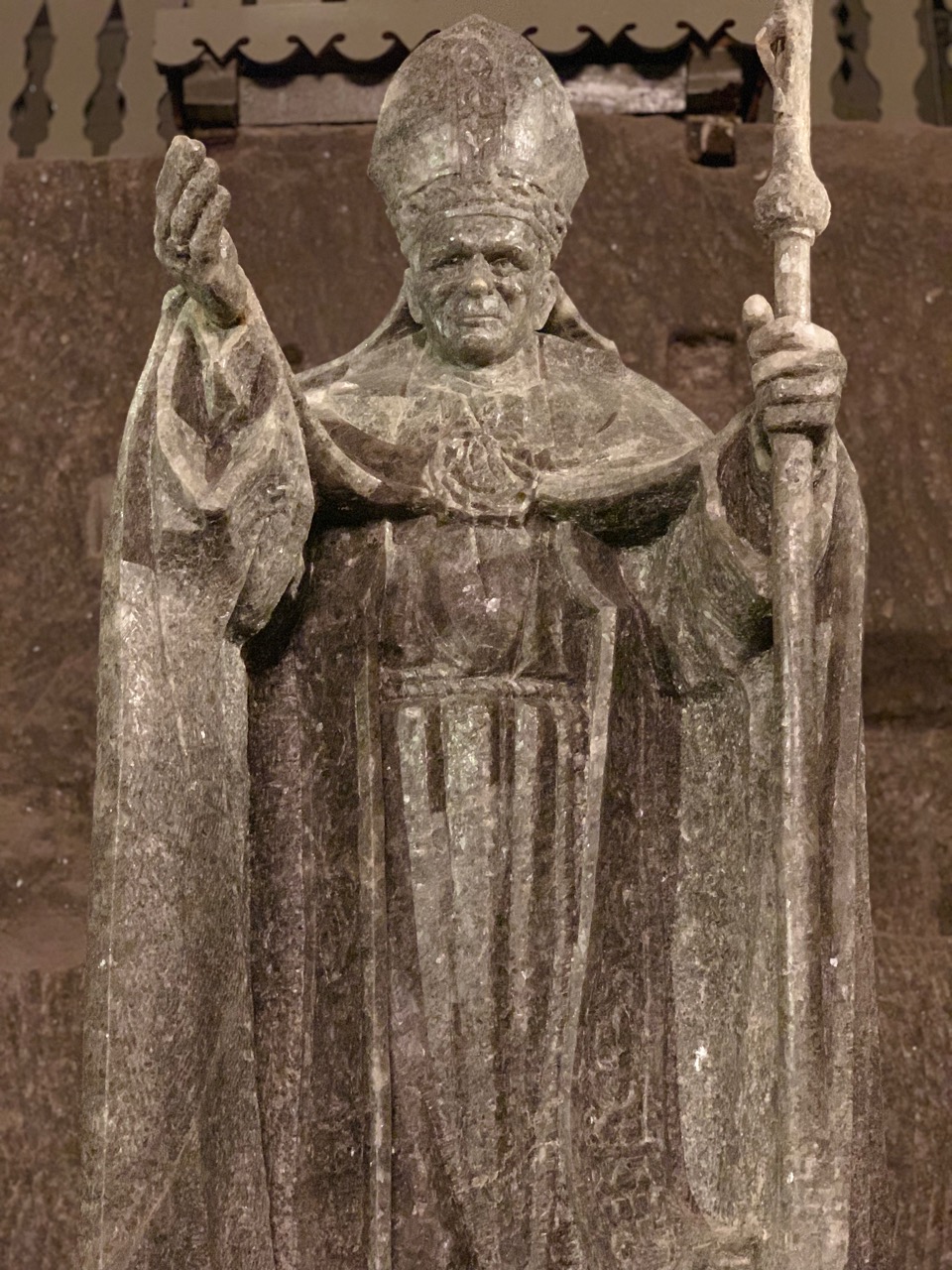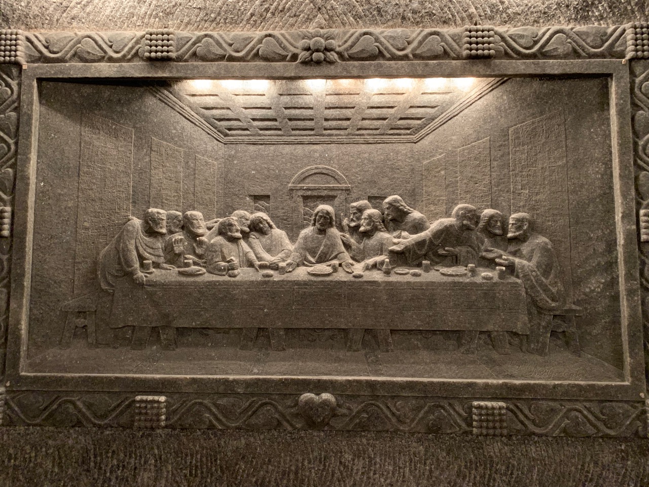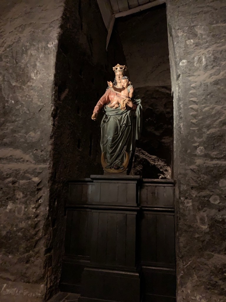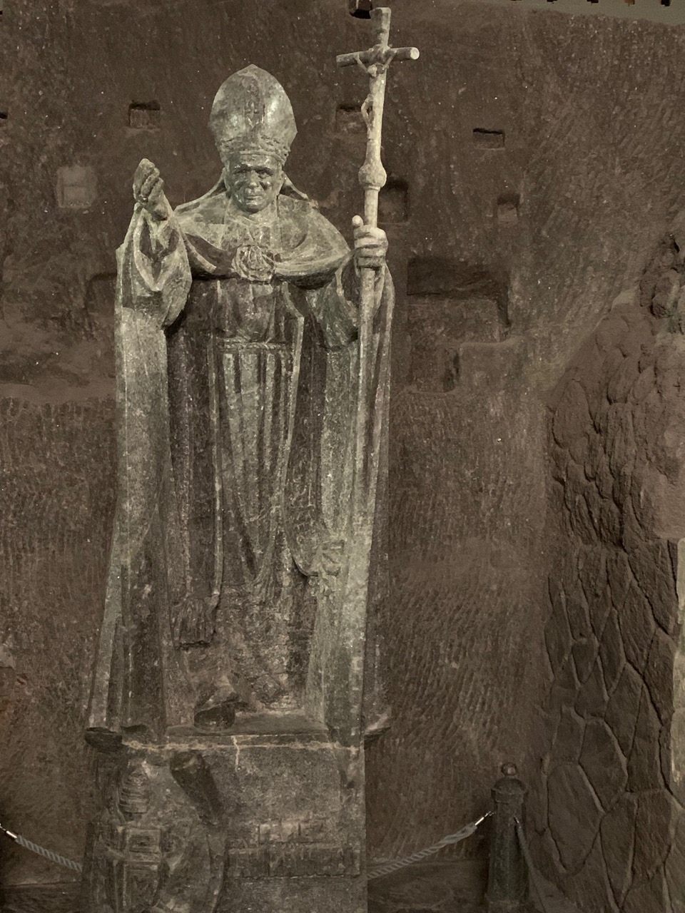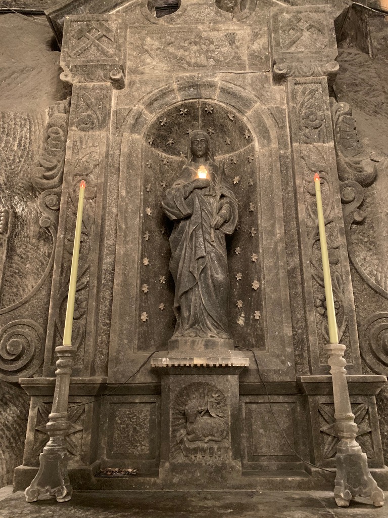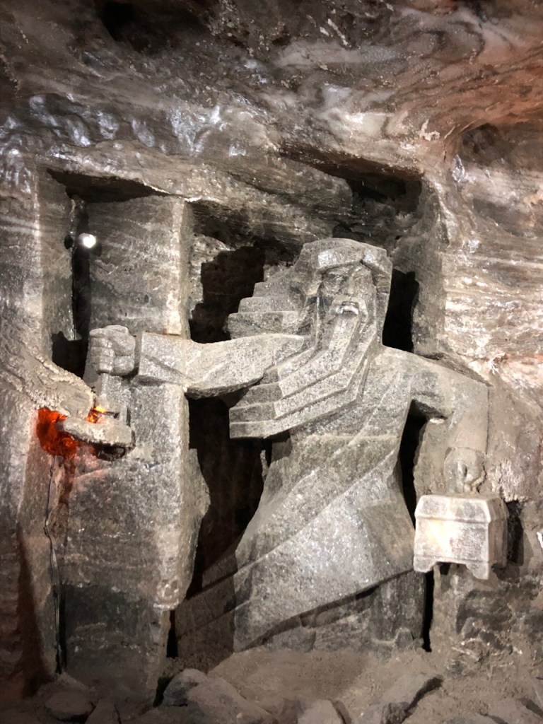 The legend of the salt mine is that Kinga, (who was later canonized the patron saint of salt miners as St. Kinga) the daughter of the King of Hungary Bela IV and wife of Polish ruler, Boleslaw V, threw her engagement ring in a Hungarian salt mine and it magically made salt appear in Poland (as well as her ring). To commemorate this legend (as well as political, religious, and other figures) miners carved rock salt sculptures in large chambers throughout the mines.