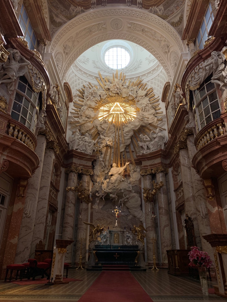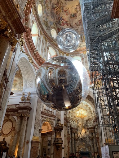 We bought a ticket to enter Karlskirche not really knowing what we were buying a ticket for. We followed a sign upstairs to see a small and uninspired display of religious artifacts. As we walked back down in disappointment we pondered asking for our money back. But then we noticed a door to the main church. Upon entering we were surprised to see two gigantic orbs suspended from the ceiling. It was an unexpected art display with a small queue waiting for an elevator to take you into the dome of the church to see the paintings on the ceiling up close as well as view the orbs from above. It was a very cool and impressive art exhibit.