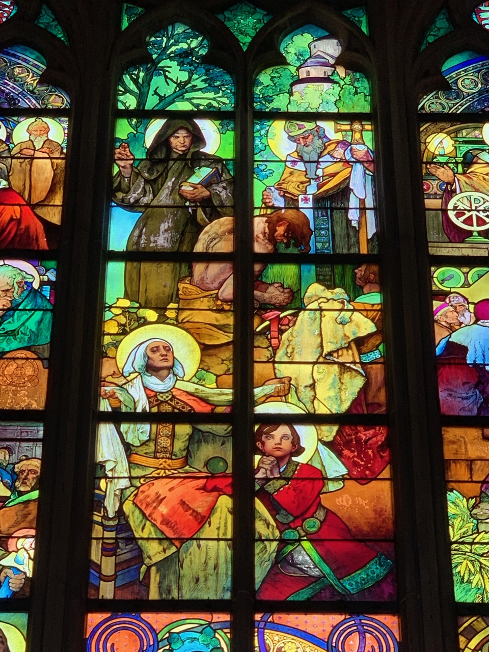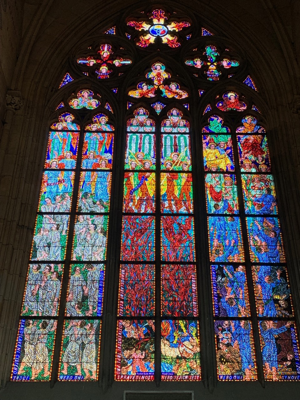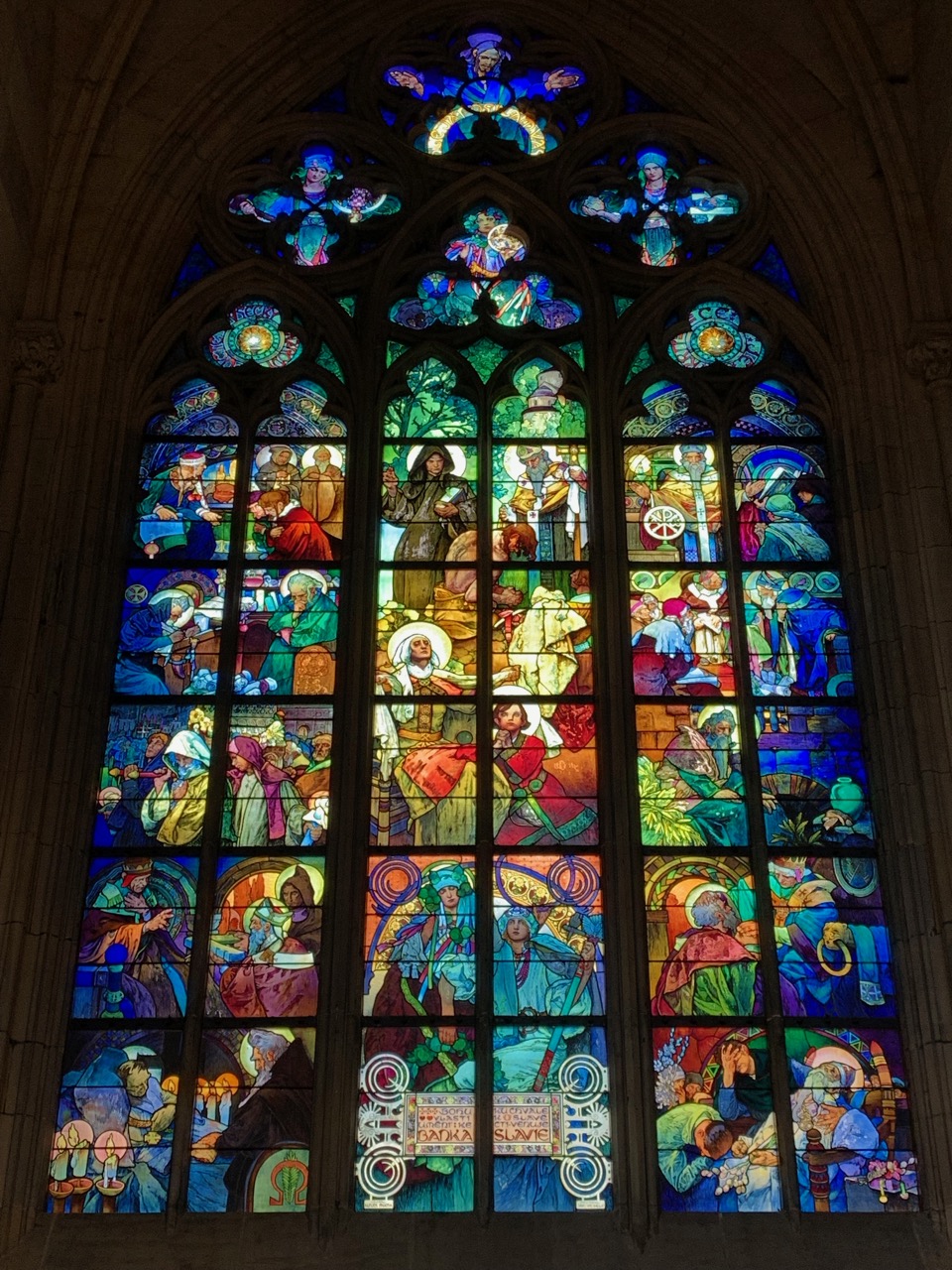 We headed towards St. Vitus Cathedral which I had visited back in 1991 and had incorporated the cathedral exterior into my college senior film project. But, I had never been inside. When we entered the cathedral I was enthralled with the spectacular stained glass, including one by Alphonse Mucha who’s museum we had gone to yesterday. Sorry for all the pictures, but the glasswork was truly amazing and the weather perfect for illuminating it.