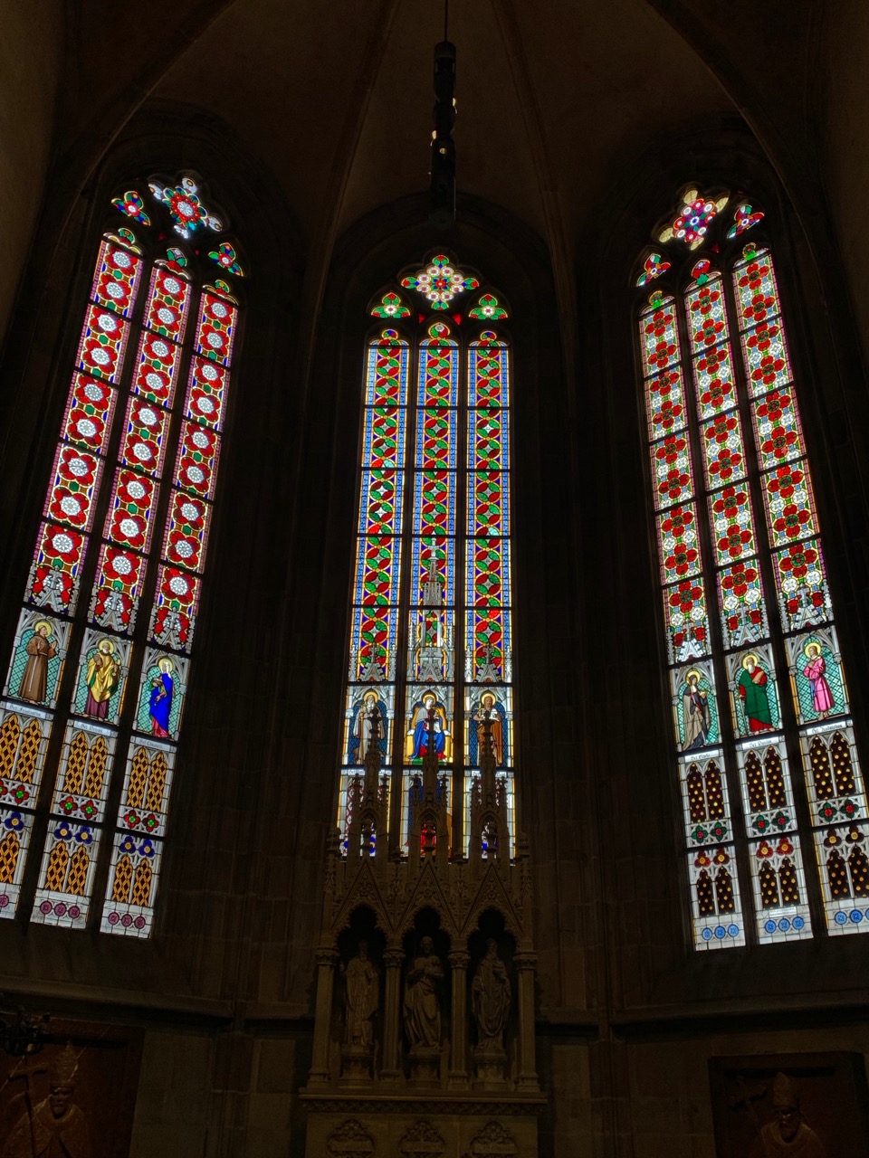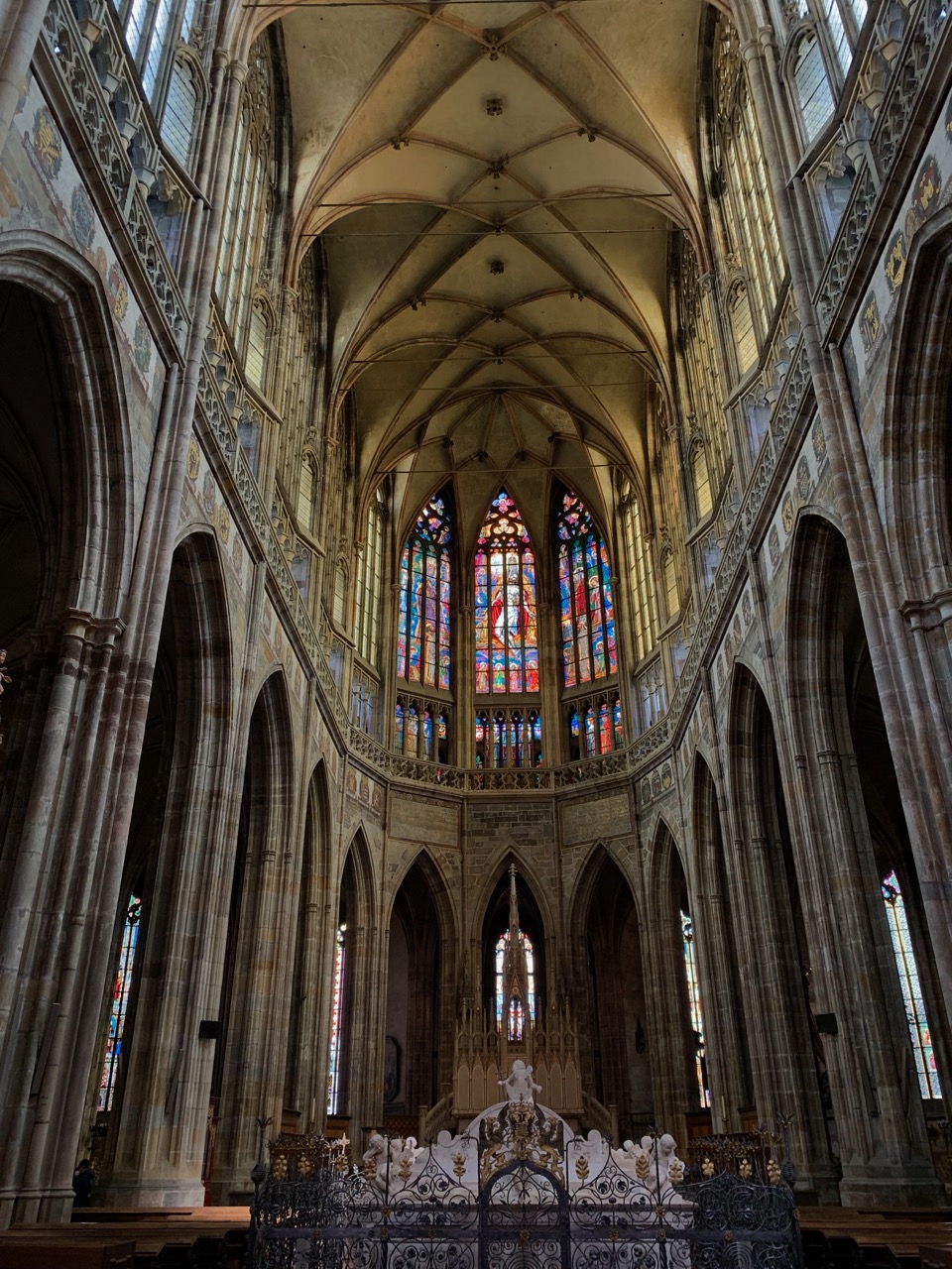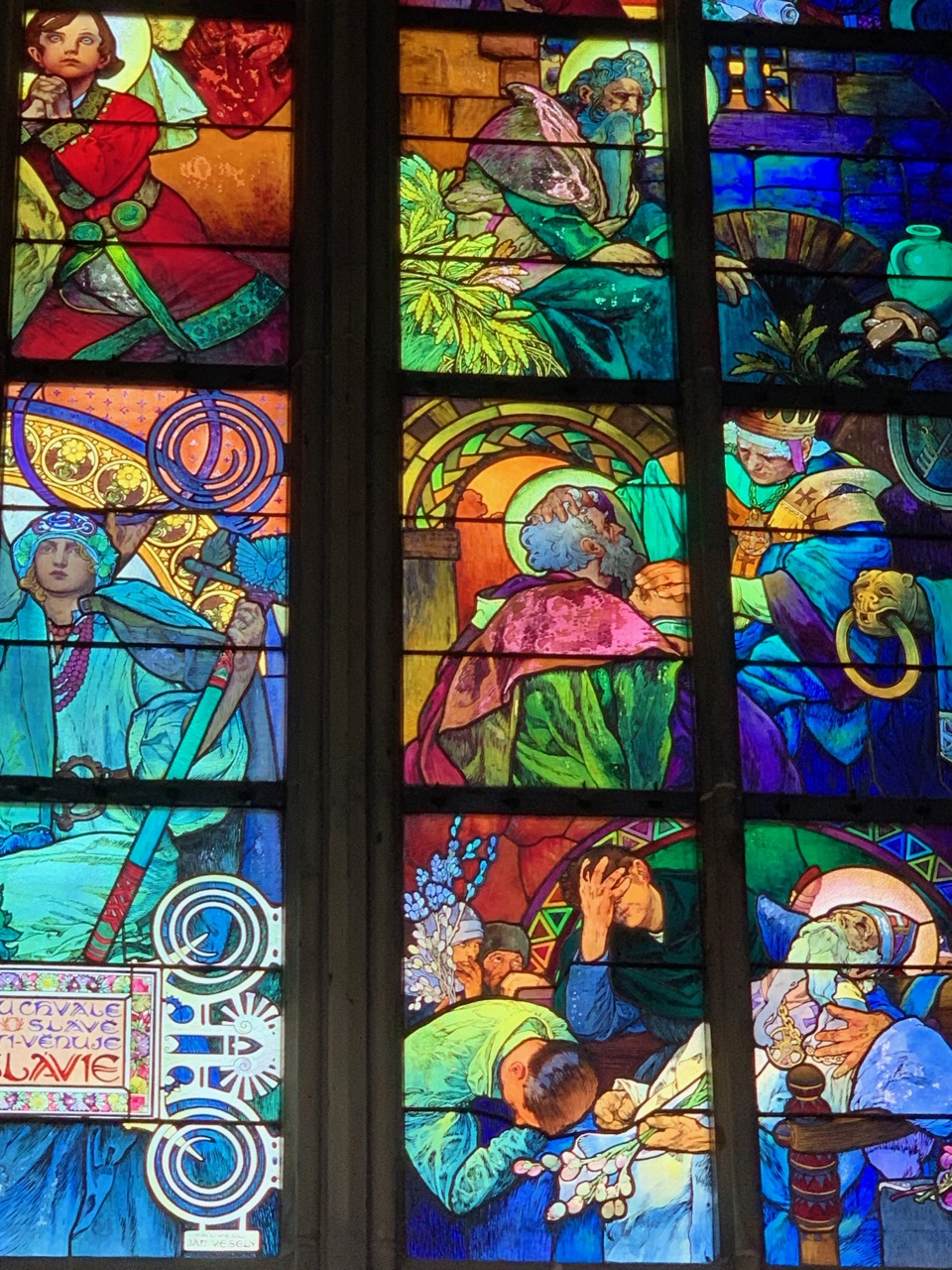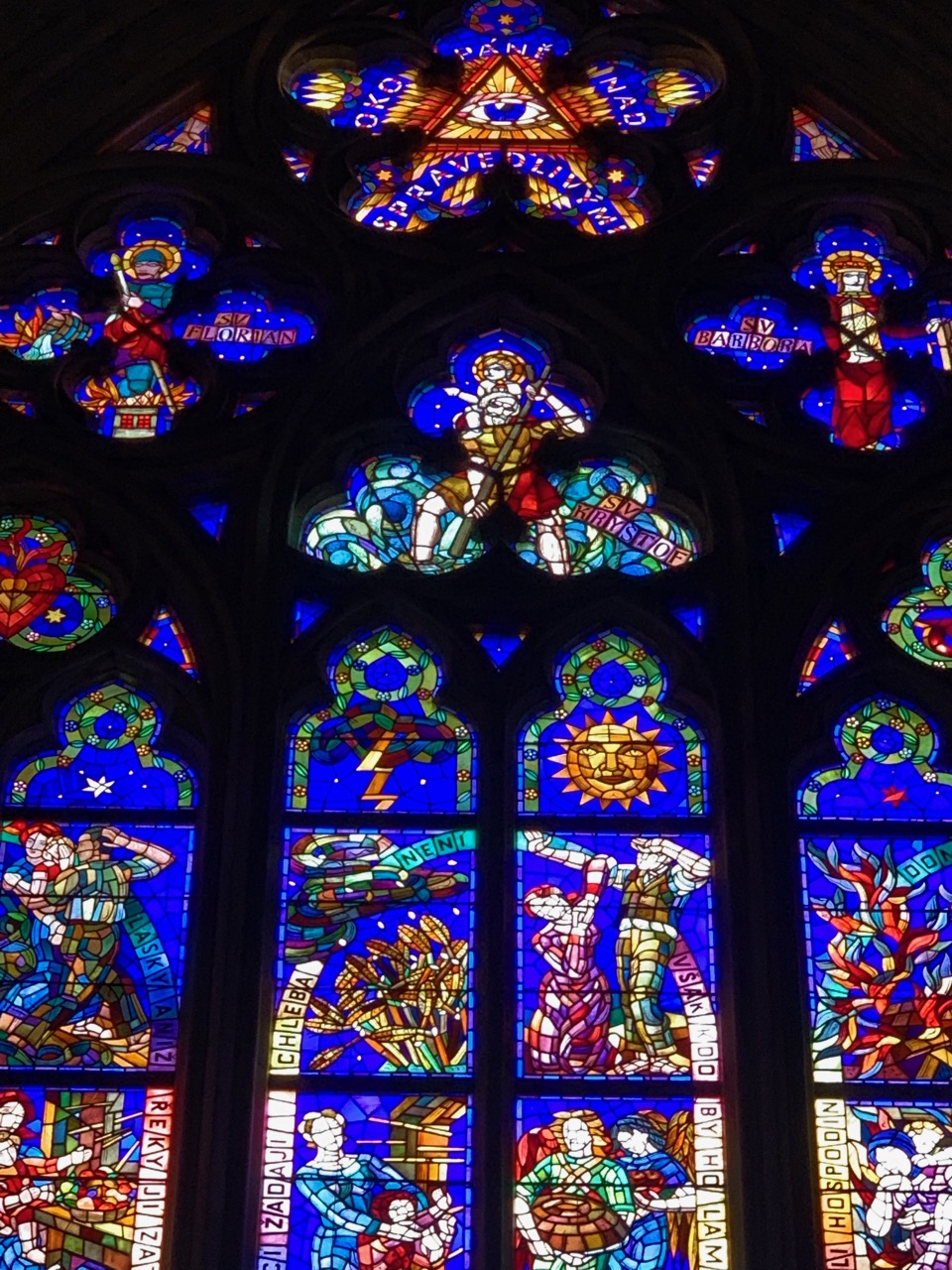 We headed towards St. Vitus Cathedral which I had visited back in 1991 and had incorporated the cathedral exterior into my college senior film project. But, I had never been inside. When we entered the cathedral I was enthralled with the spectacular stained glass, including one by Alphonse Mucha who’s museum we had gone to yesterday. Sorry for all the pictures, but the glasswork was truly amazing and the weather perfect for illuminating it.