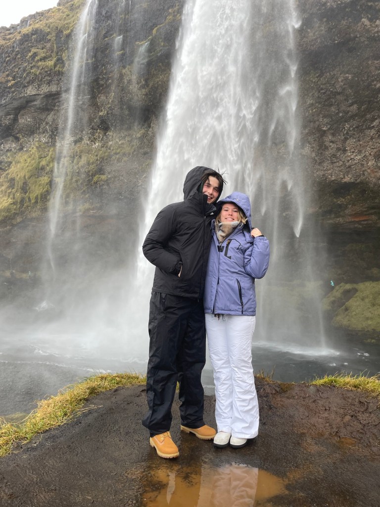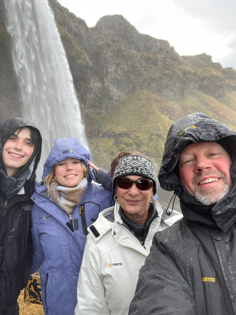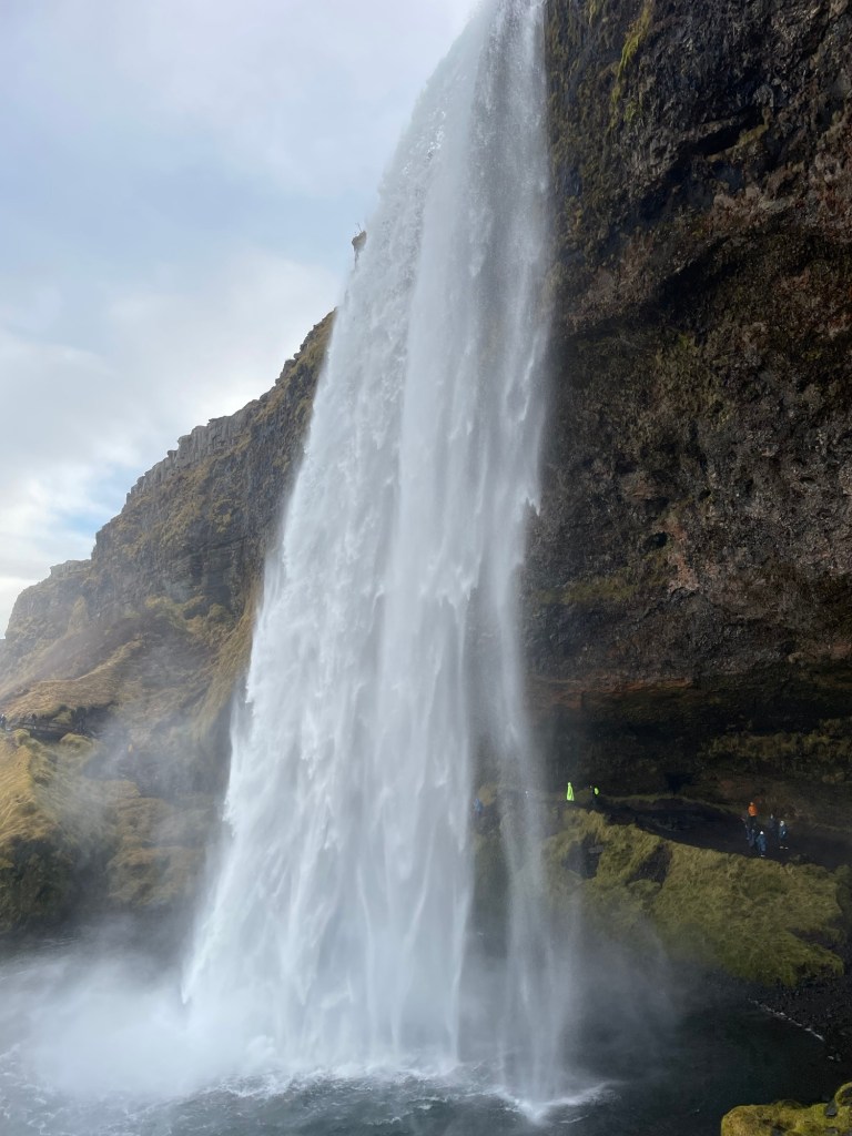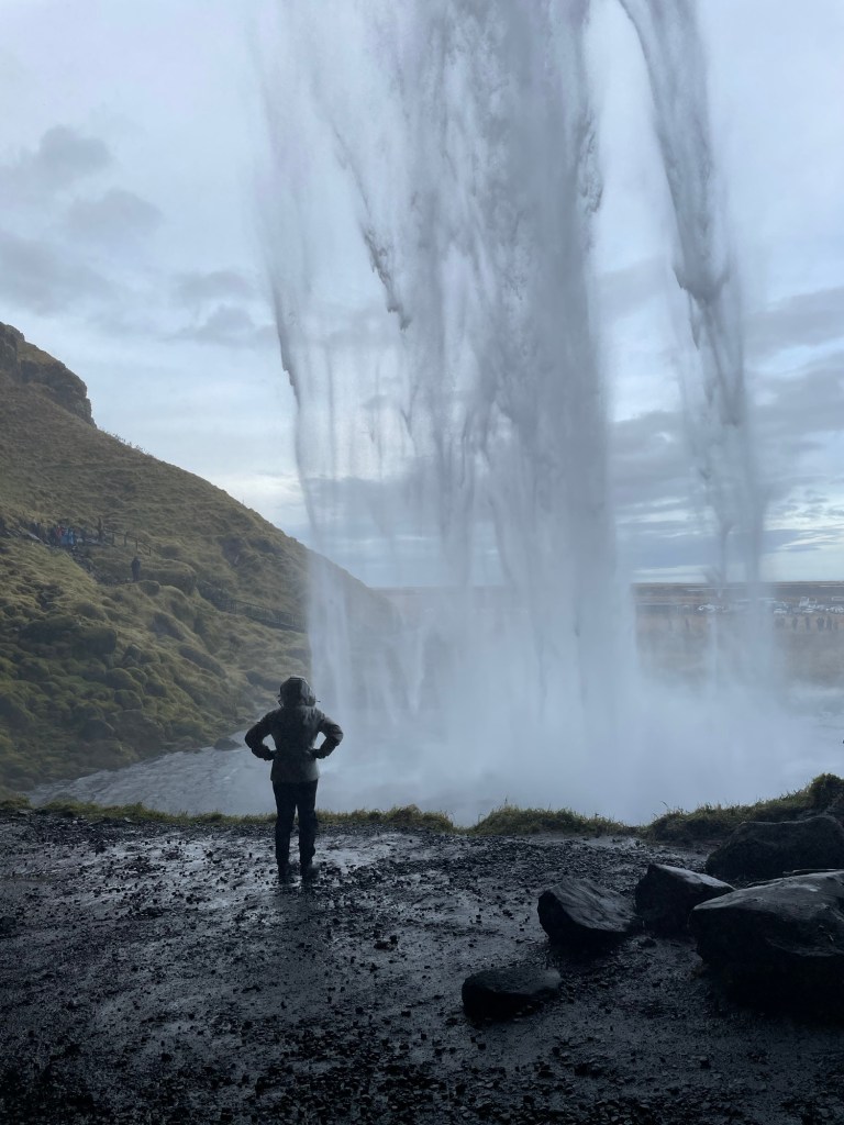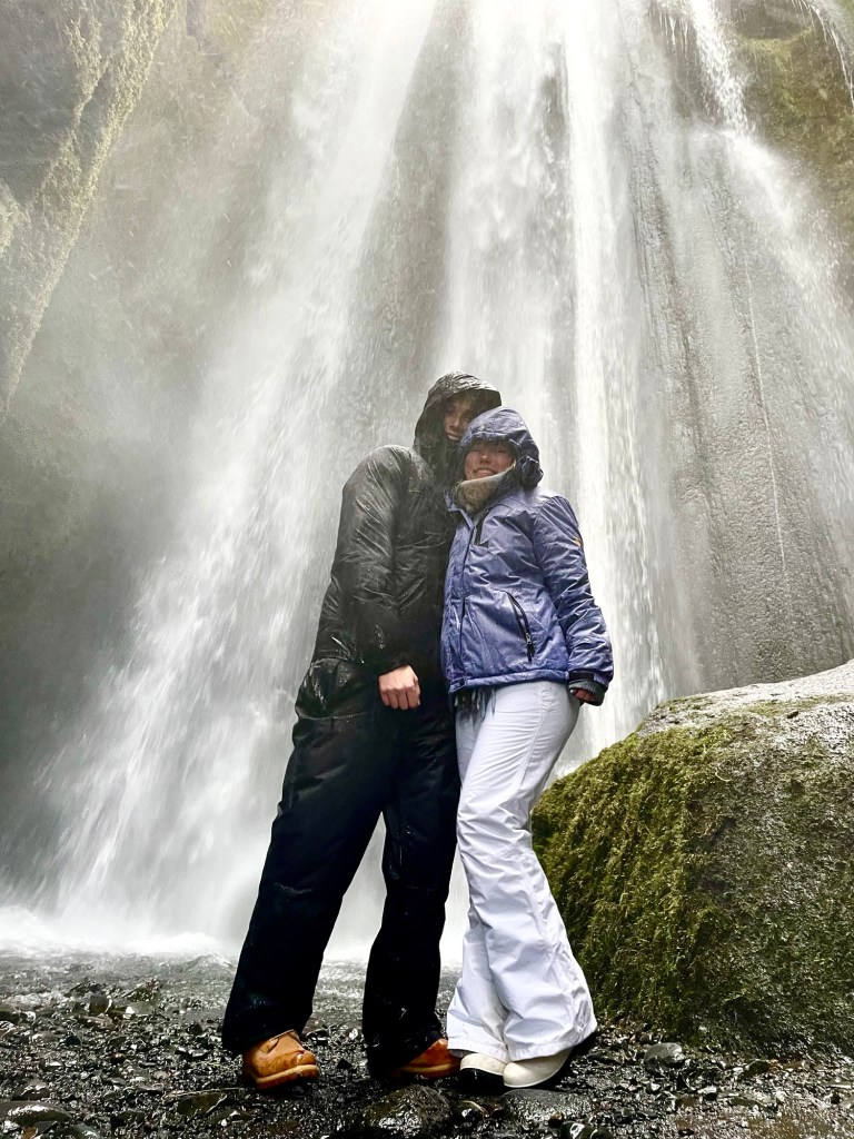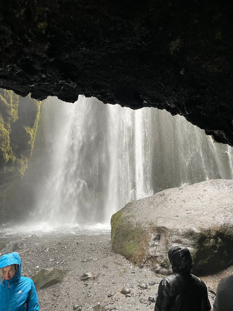 We drove straight from Rekjavík to Seljalandsfoss. Seljalandsfoss is one of Iceland’s most captivating waterfalls, cascading gracefully from a height of 200 feet. What makes this waterfall truly unique is the path that allows visitors to walk behind the shimmering curtain of water. As you venture behind Seljalandsfoss, the roar of the falling water and the mist in the air create an exhilarating, immersive experience. Top of the line rain gear is a must! Luckily, upon our return to Iceland we packed and prepared appropriately for the cold, wind, and rains.
