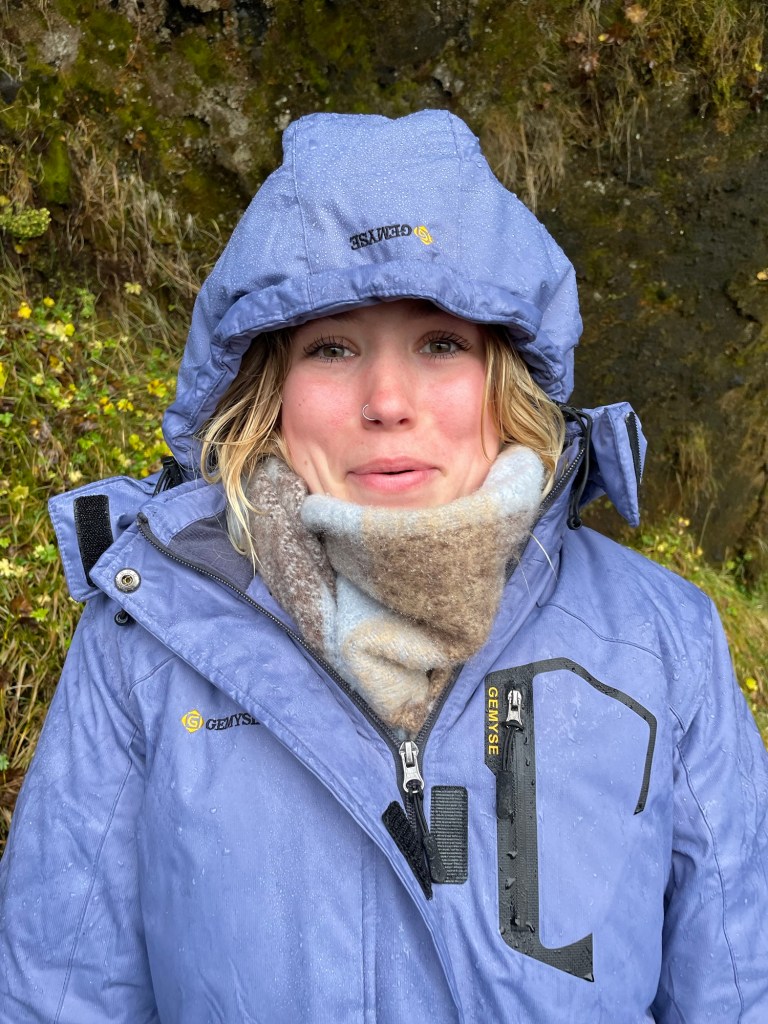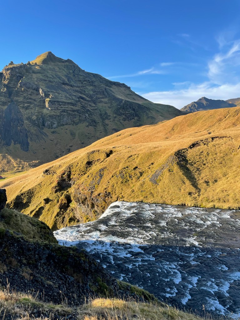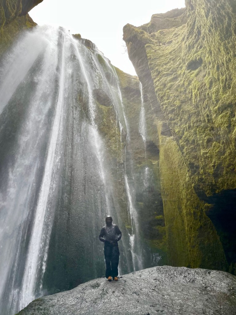 Just a short 10-15 minute walk away is the hidden gem Gljúfrabúi, a smaller but equally enchanting waterfall. To reach it, you navigate a narrow entrance between cliffs, carefully stepping on rocks in the river to keep your feet dry while hugging the cave wall. The rocks here are a two way path, so you’ll have to take turns letting people in and out of the grotto. As you approach the waterfall, the deluge of water and mist intensifies, and it feels as though you’re taking a cold shower, enveloped by the cold raw beauty of this land. Make sure you have waterproof shoes.