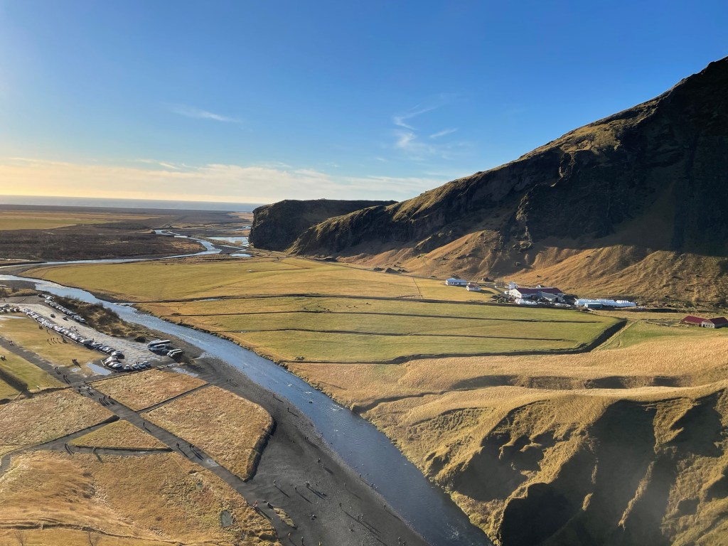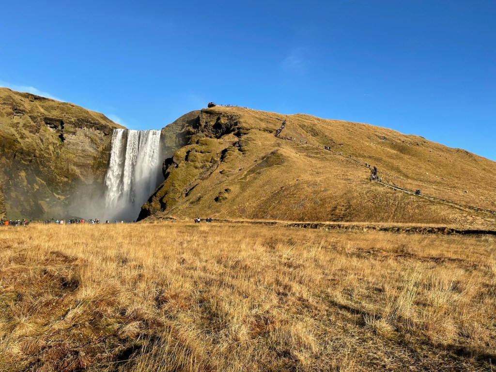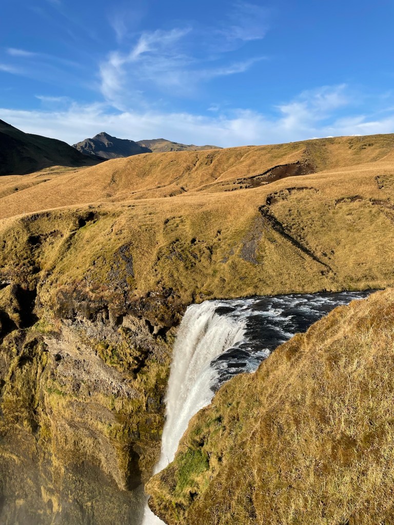 Not far from Seljalandsfoss, a short drive brought us to the majestic Skógafoss, one of Iceland’s largest and most famous waterfalls. Plunging from a height of 200 feet and spanning 82 feet across, Skógafoss is a breathtaking spectacle of raw power and beauty. The thundering cascade creates a mist that often produces vibrant rainbows on sunny days (and today was no exception), adding magic to an already miraculous scene. We hiked up close to the waterfall’s base, feeling the cool spray on our faces as we touched the rainbows. Then we took the steep staircase to the top for a panoramic view of the pastoral surroundings and the river below. Skógafoss is not just a sight to behold but an experience that immerses you in the awe-inspiring natural wonders of Iceland. How could it get any more amazing…but it just does.