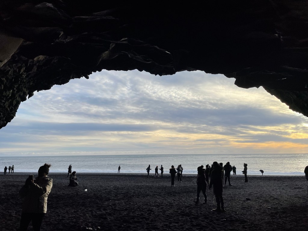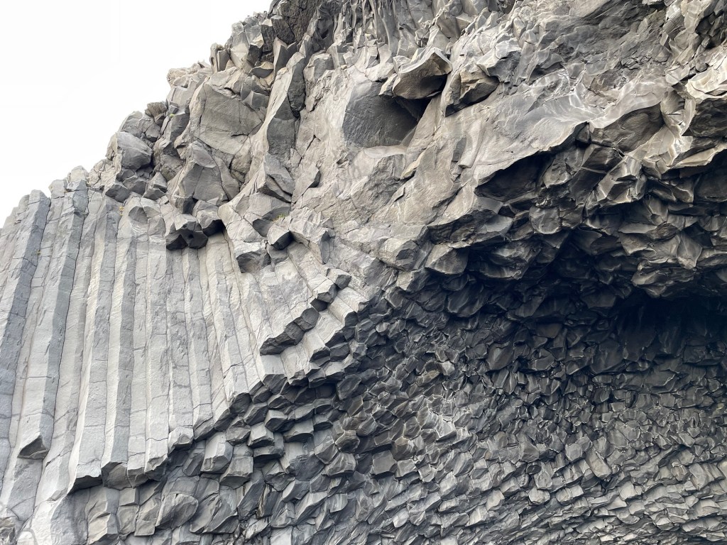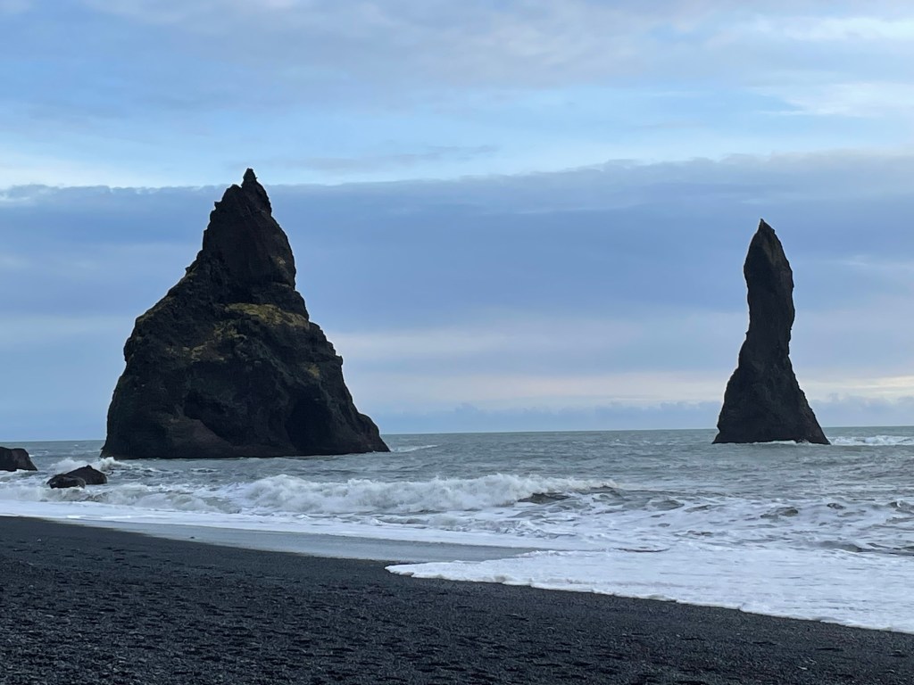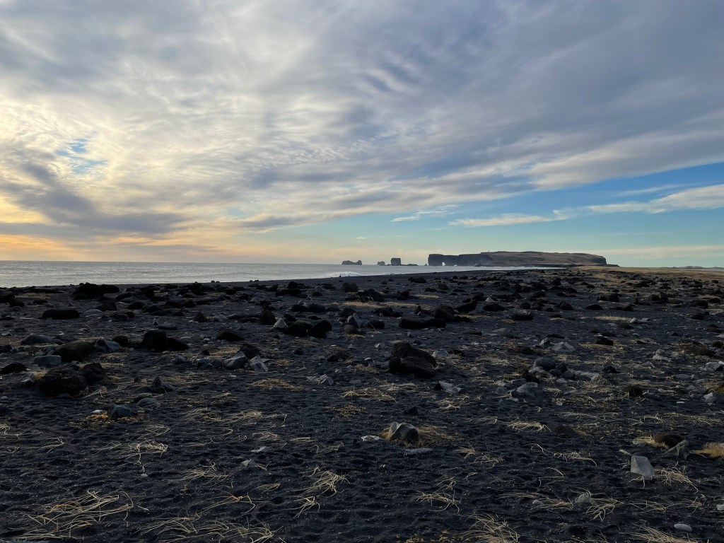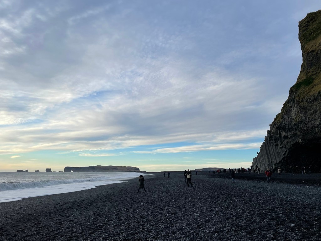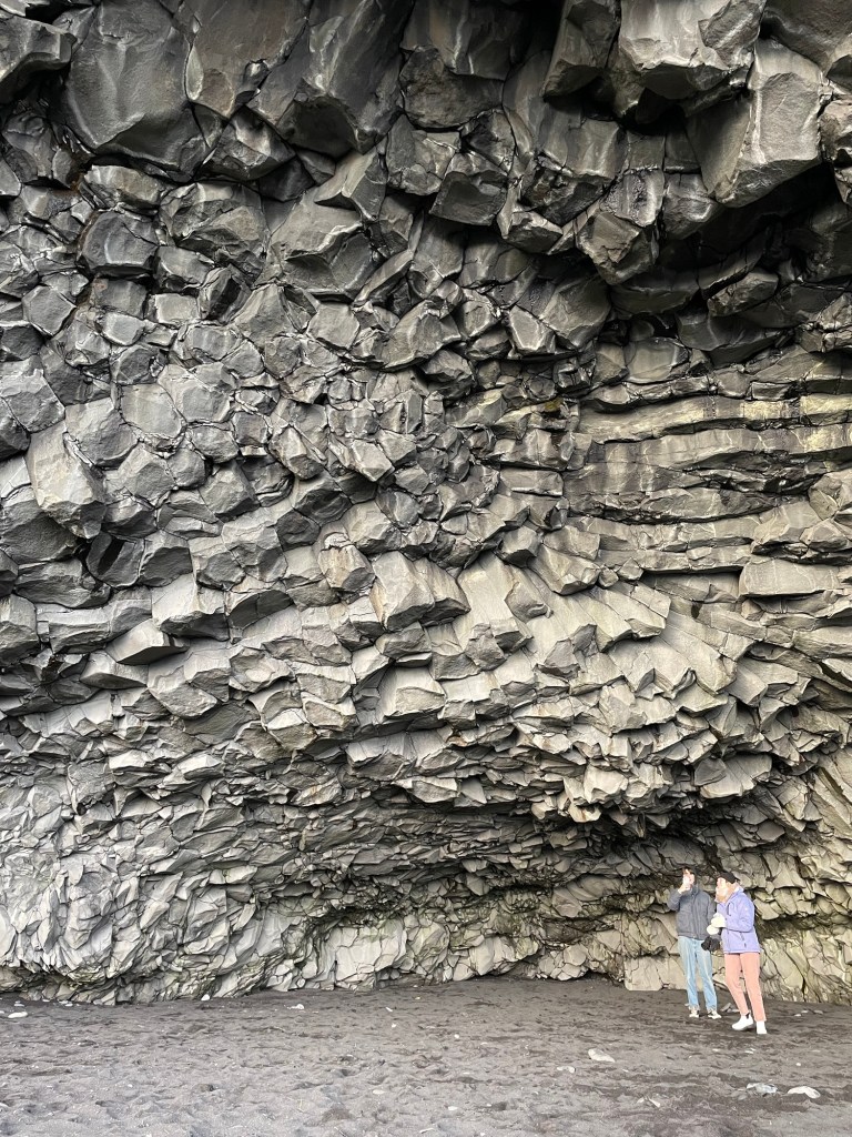 Our next stop was Dyrhólaey Promontory, a dramatic headland on Iceland’s southern coast, which offers some of the most breathtaking views in the country. Rising 300 feet above the near freezing Atlantic Ocean, this natural marvel is renowned for its striking rock arch, carved by centuries of relentless pounding waves. The promontory provides an excellent vantage point to witness the contrast between the black sand beaches of Reynisfjara (our next stop) to the west and the vast lava fields to the east looking back towards Skógafoss. It was extremely windy here, and therefore cold. As we stood on the edge, with the wind whipping us to the crack of crashing waves below, we felt a profound connection to the rugged and untamed beauty of Iceland’s coastline.