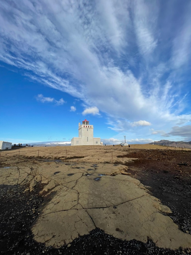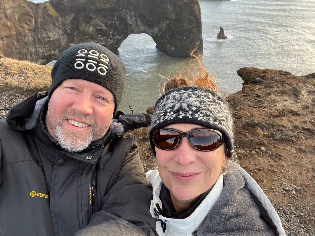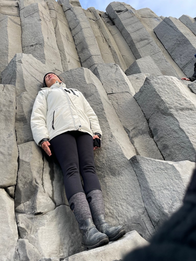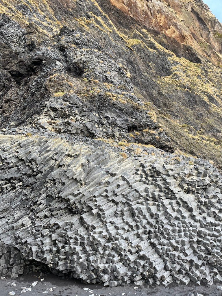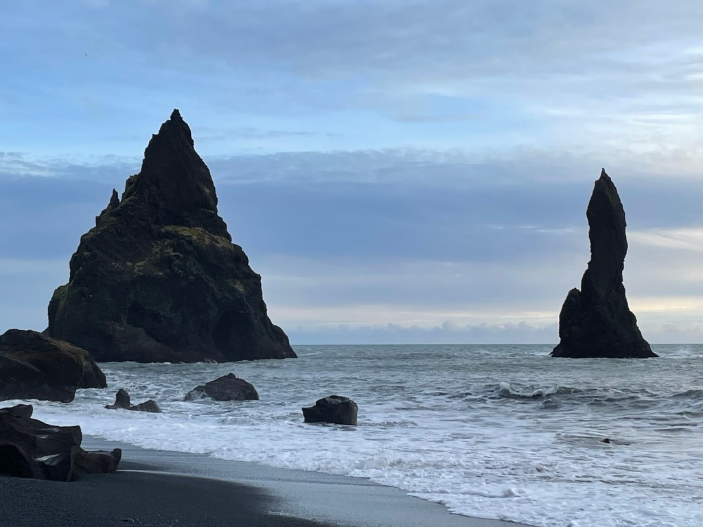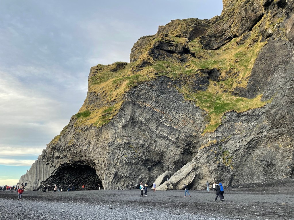 Our next stop was Dyrhólaey Promontory, a dramatic headland on Iceland’s southern coast, which offers some of the most breathtaking views in the country. Rising 300 feet above the near freezing Atlantic Ocean, this natural marvel is renowned for its striking rock arch, carved by centuries of relentless pounding waves. The promontory provides an excellent vantage point to witness the contrast between the black sand beaches of Reynisfjara (our next stop) to the west and the vast lava fields to the east looking back towards Skógafoss. It was extremely windy here, and therefore cold. As we stood on the edge, with the wind whipping us to the crack of crashing waves below, we felt a profound connection to the rugged and untamed beauty of Iceland’s coastline.