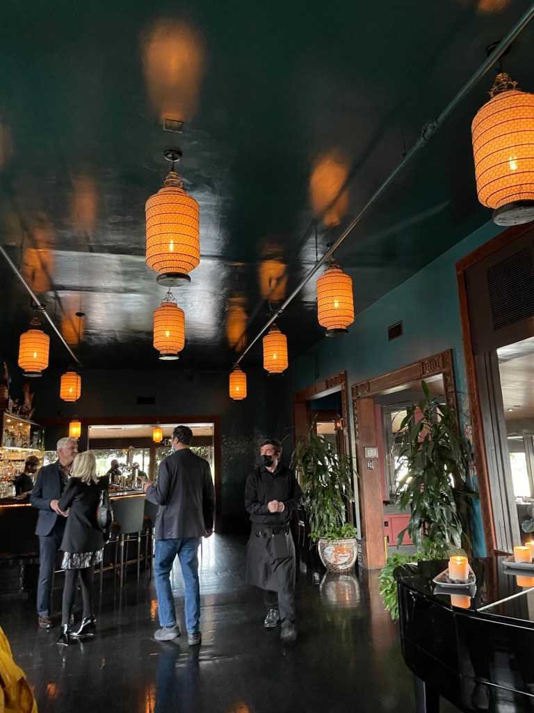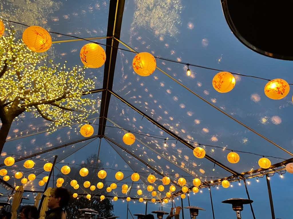 No matter the film, or dinner reservation, every detail is meticulously crafted for maximum effect. The ambiance is a captivating blend of East meets West, complete with a garden courtyard that feels plucked from a samurai epic, illuminated by soft lantern light and the perpetual petals of a blossoming cherry tree.