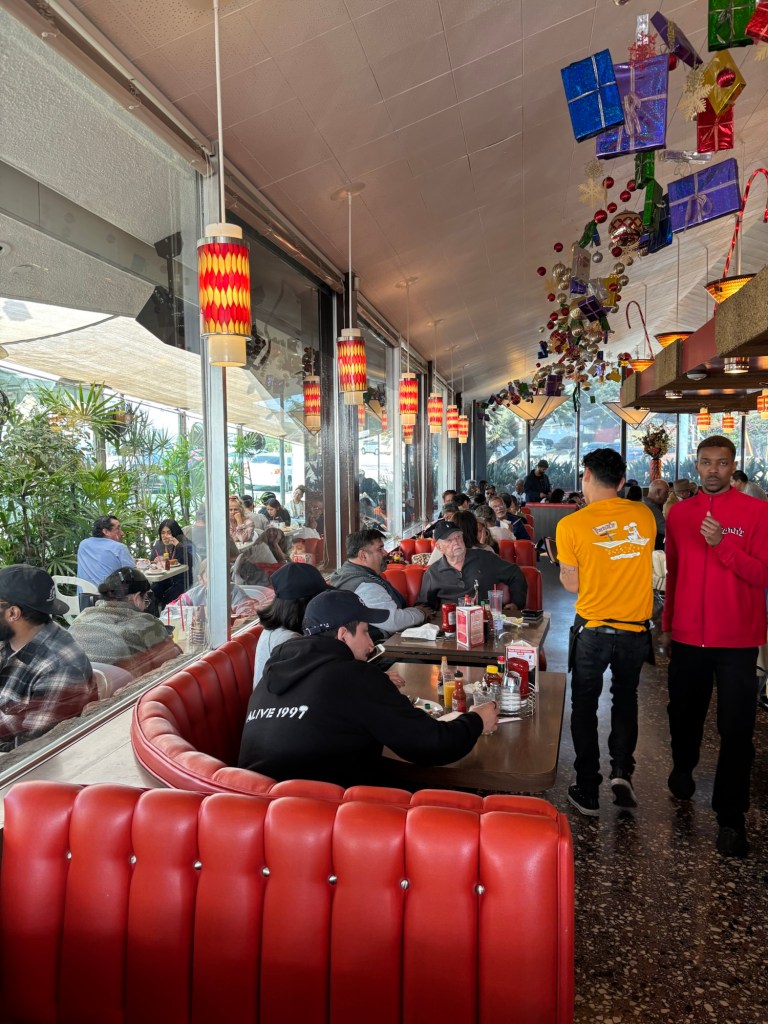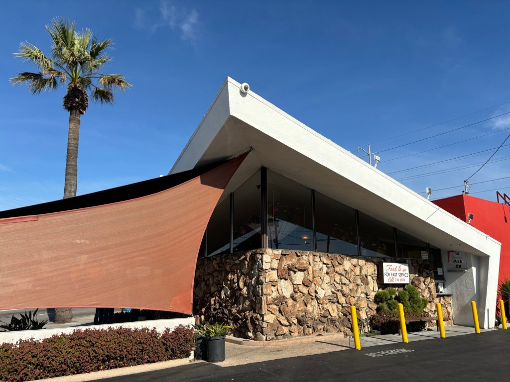 The building alone is worth a visit, featuring its striking slanted roof, glowing neon sign, expansive oversized glass windows, bold angled lines and vintage diner booths, chairs and light fixtures that transport you back to a classic moment in LA history.