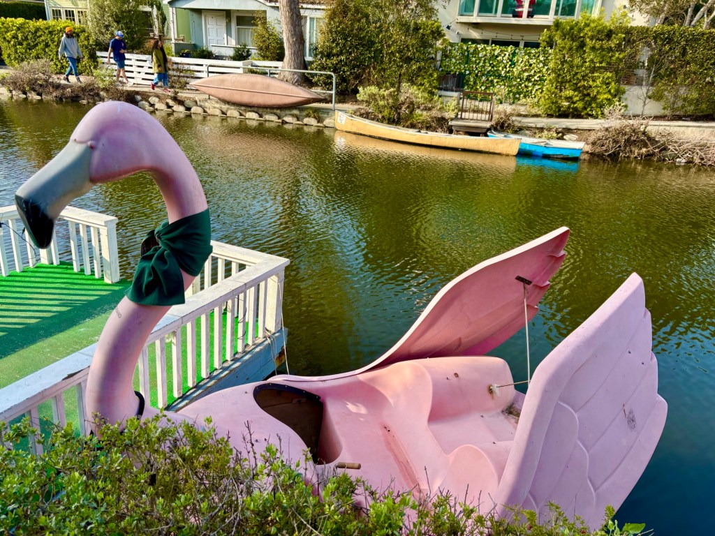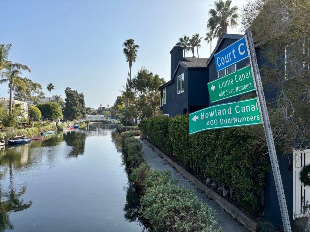 At the dawn of the 20th century, Abbot Kinney, a wealthy developer with a vision, set out to create a “Venice of America.” He dredged marshland, carved canals, and built arched pedestrian bridges to bring a taste of Italy to the California coast. It reminds me of a similar development of canals of the 1960s in Ocean Shores, Wa. While gondoliers once ferried visitors through Abbot’s waterways, it didn’t last long. By the 1920s, the automobile had taken hold, and the canals were seen as an antiquated relic of a pre-car world.