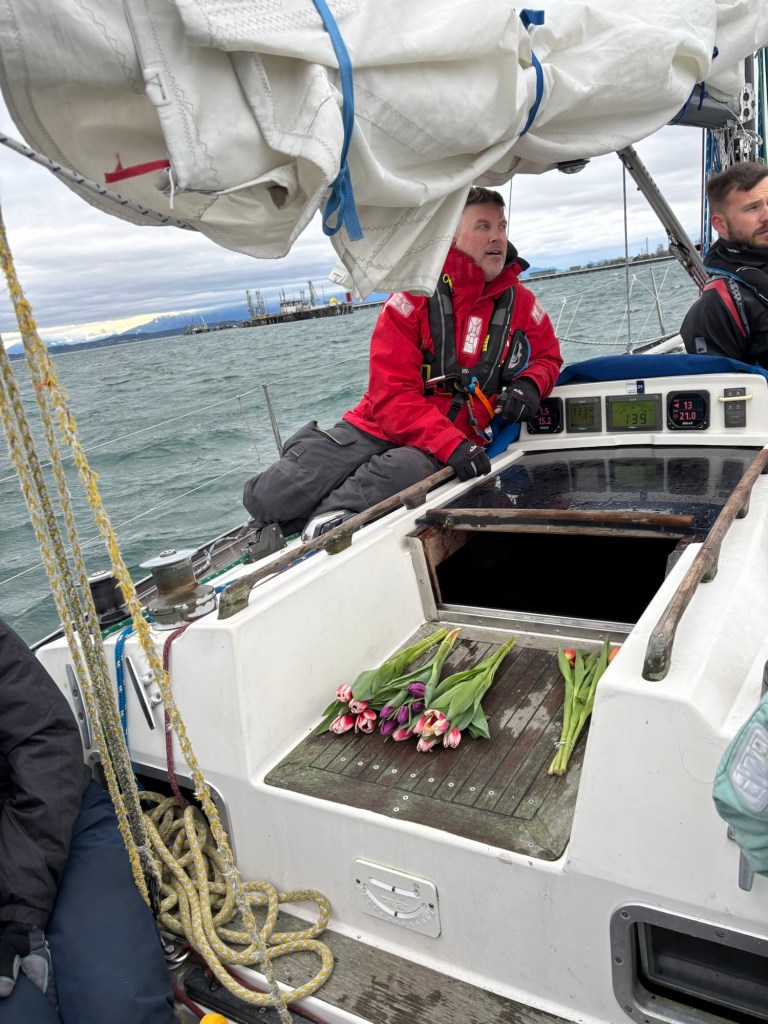 On race day, February 22nd, 2025, we gathered—family, old friends, former students who had sailed with him over the years, and my daughter, who had flown in from LA—all wearing our full foul-weather gear. We headed to the starting line, where we tossed fresh tulips from Pangaea’s bow onto the start-line buoy near the Anacortes Refinery, a place so many of us had passed countless times during Wednesday night races.