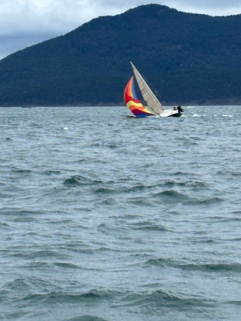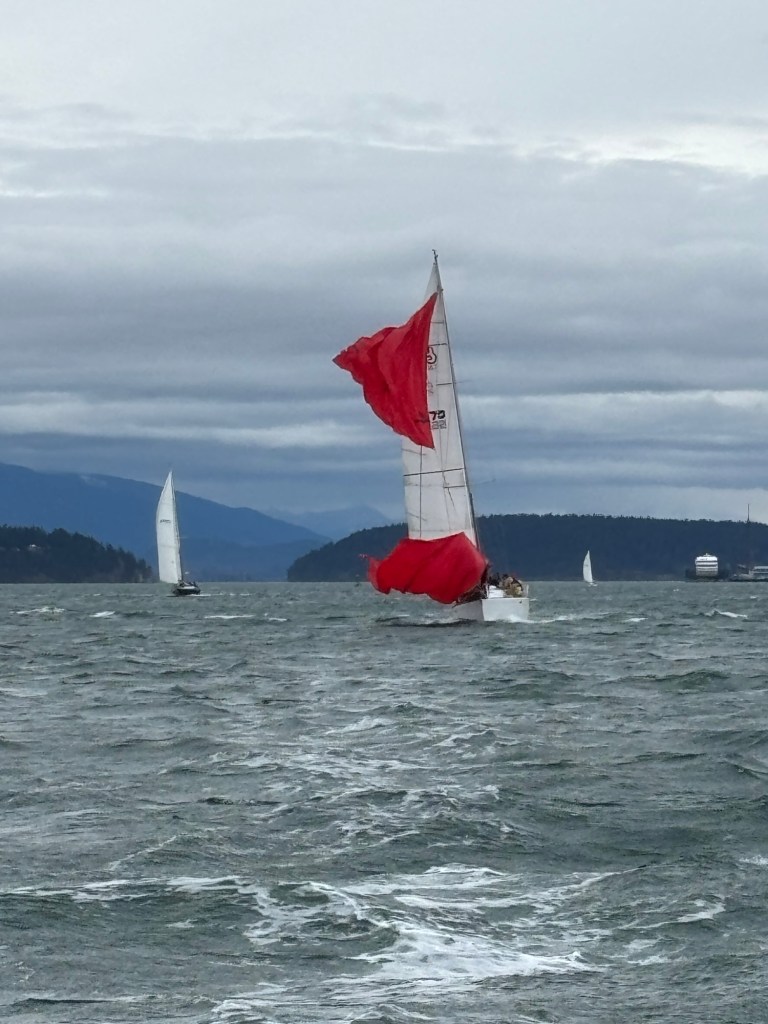 The winds were fierce—average speeds of 25-30 knots, with gusts reaching 35-40. Pangaea leaned hard, healing to 45 degrees, with gusts pushing her leeward rail deep into the Salish Sea, pitching as far as 50 degrees several times. The ballast of the crew riding the rail, and her 11,000-pound lead keel kept us steady, and while many other boats struggled with blown-out spinnakers and flapping sails, Pangaea plowed forward. We embraced the wind and the sea, rolling into Friday Harbor in record time—well under 3 hours—and placing 3rd overall.