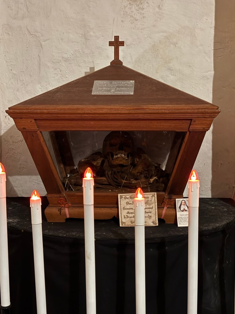Just around the corner, we visited the Black Friars Church. In stark contrast to the silenced reverence of the nunnery, this church was filled with opulent treasures, beautiful painted ceiling frescoes, and slightly disturbing artwork. The church’s intricate woodwork and gilded altars reflected a display of patriarchal wealth and power, albeit delivered with undeniable beauty.