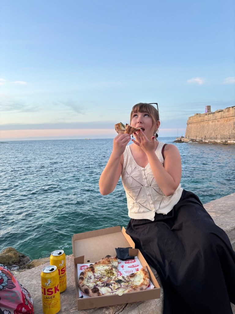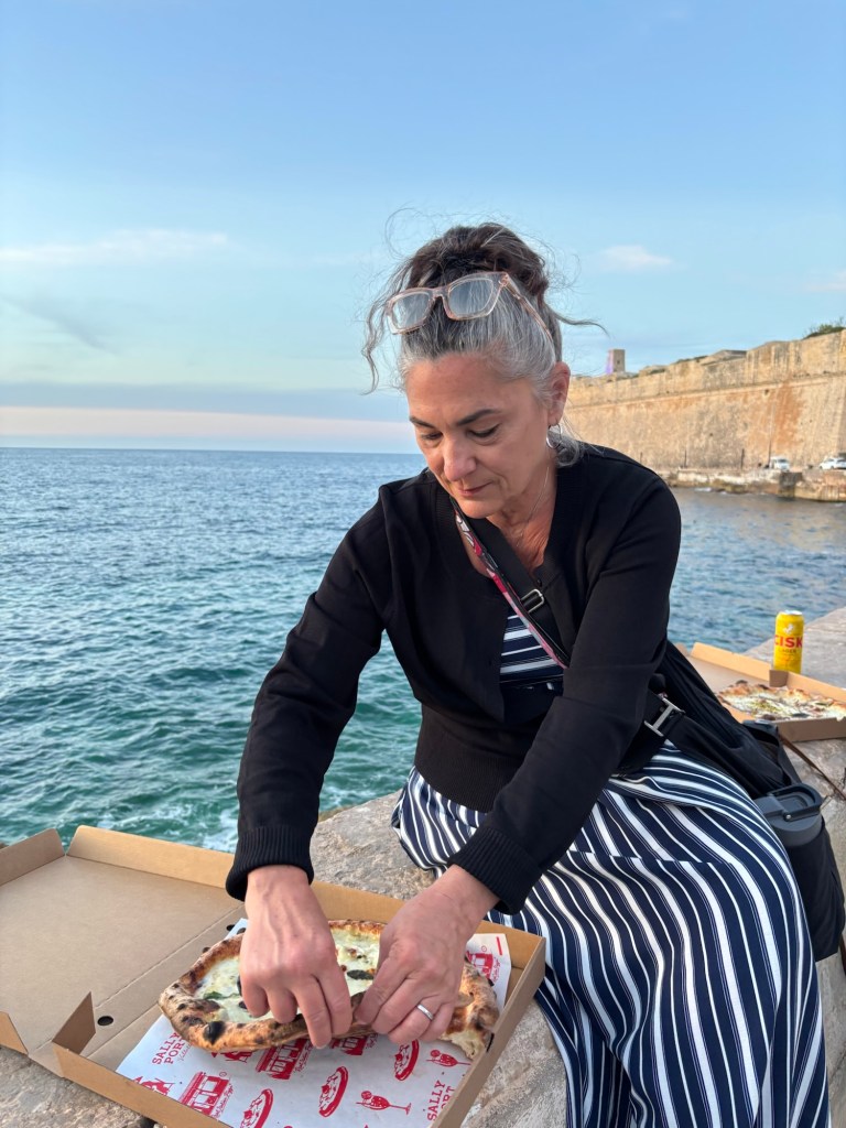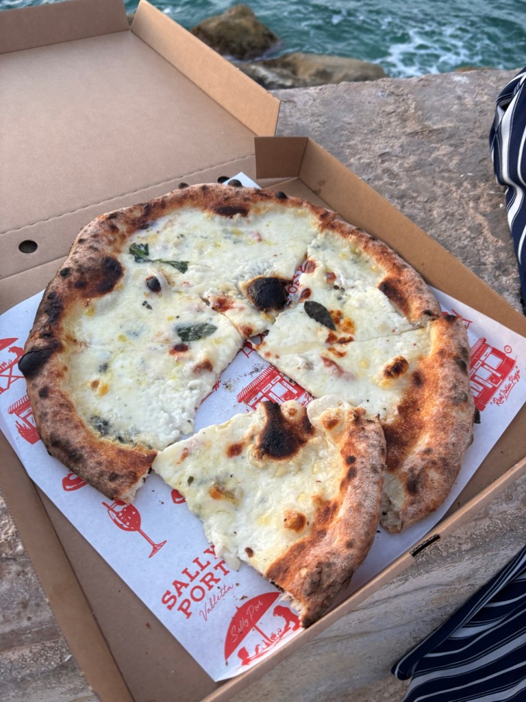 With our pies in hand, their crusts charred to perfection, we made our way to the nearby breakwater wall of St. Elmo Bay near the Fort St. Elmo. As the sun dipped below the horizon, the sky transformed into hues of orange and pink. We sat by the water, eating our pizzas with waves gently lapped at the shore and looking north towards Sicily, our next destination. Nicky said: “I feel like a teenager again!”. We all did! It was the perfect moment of food, friendship, and atmosphere, creating one of the best meals of our trip and making us feel like we had truly conquered the day, like many Maltese conquerors before us.